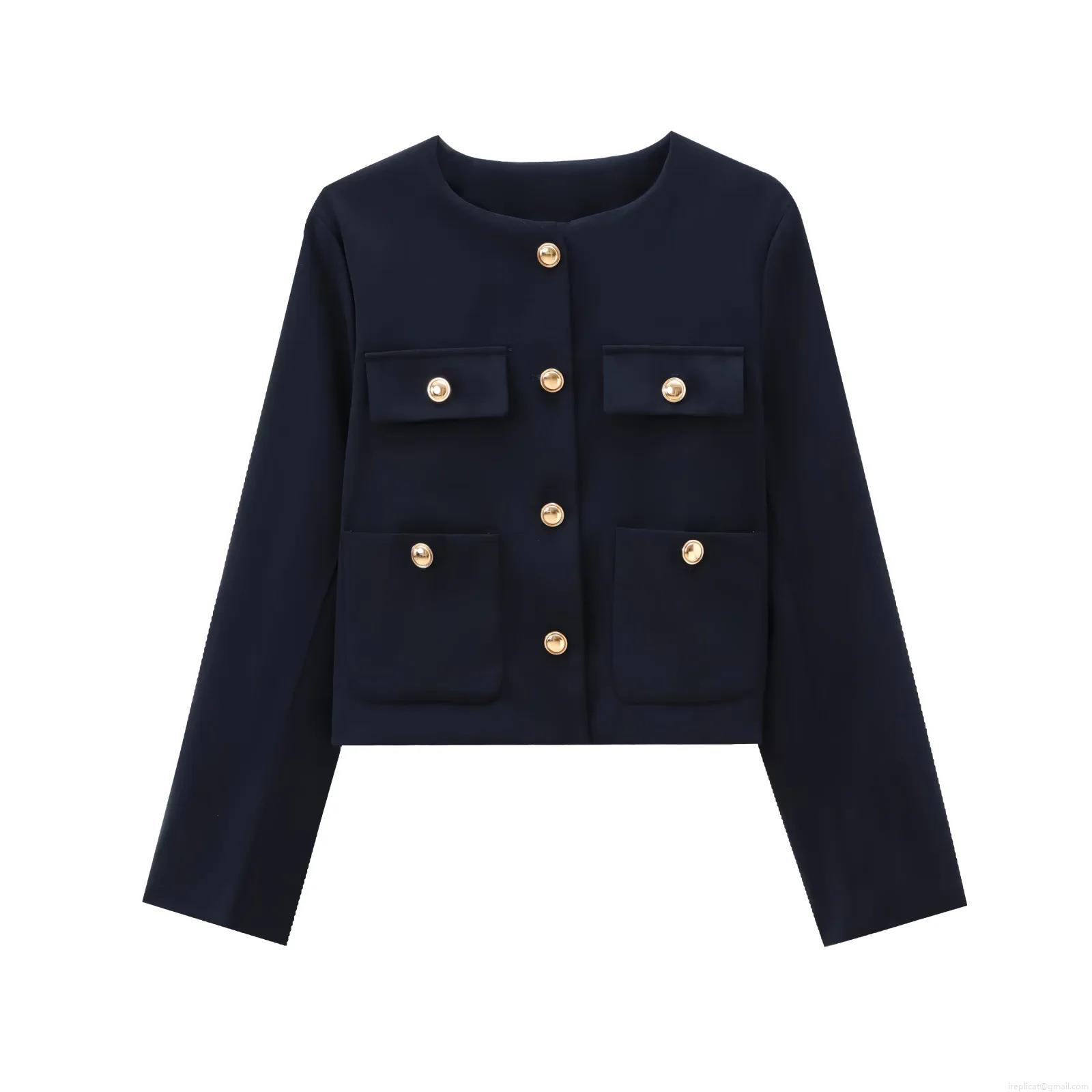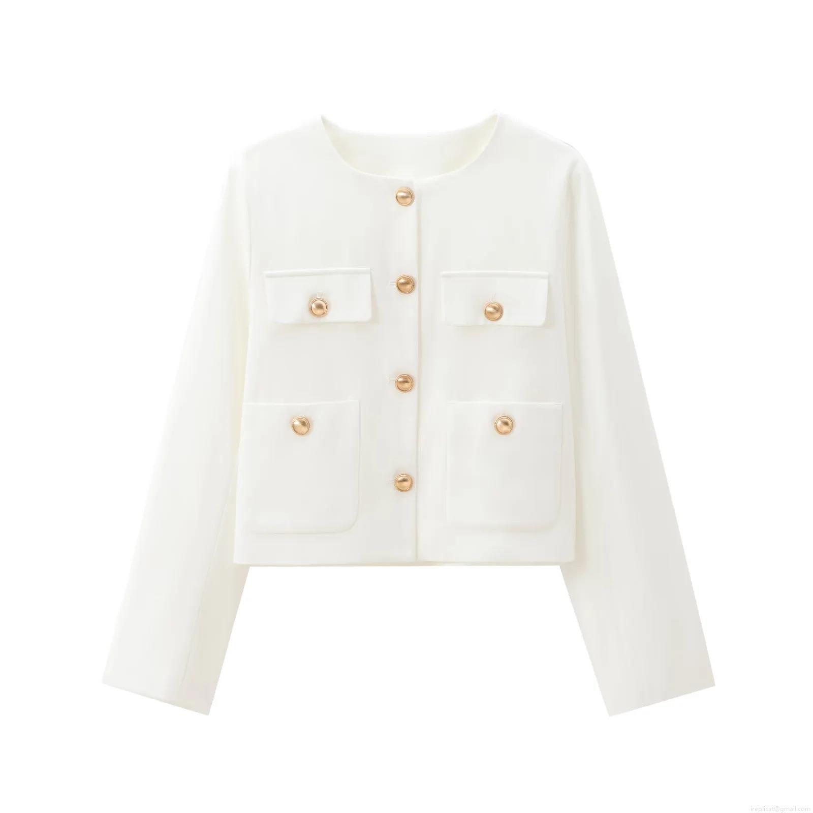 • Women's Elegant Tweed Style Short Jacket Polyester Long Sleeve Round Neck Coat With Gold Buttons For Daily Casual Office Lady