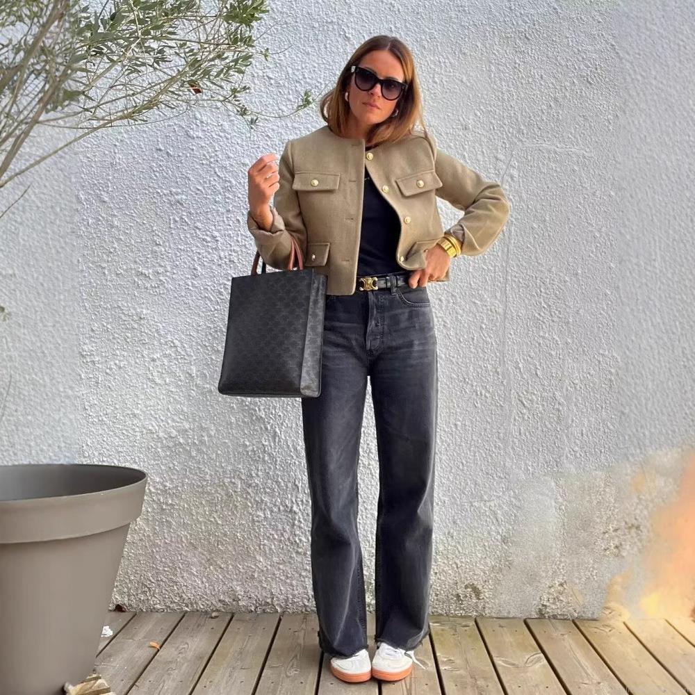 • Women's Elegant Tweed Style Short Jacket With Gold Metal Buttons And Four Pockets Polyester Long Sleeve Round Neck Outerwear For Autumn Spring Daily Commute Office