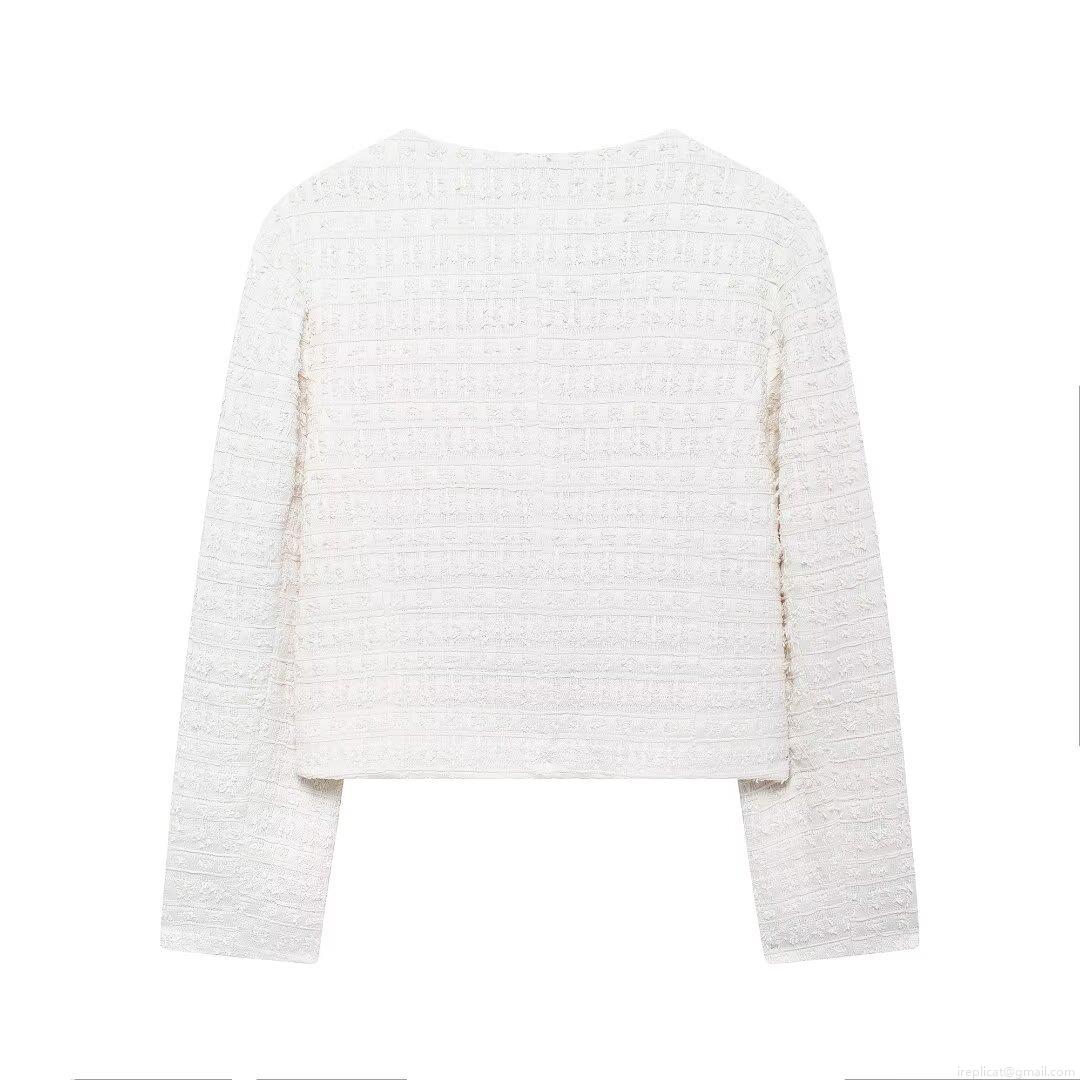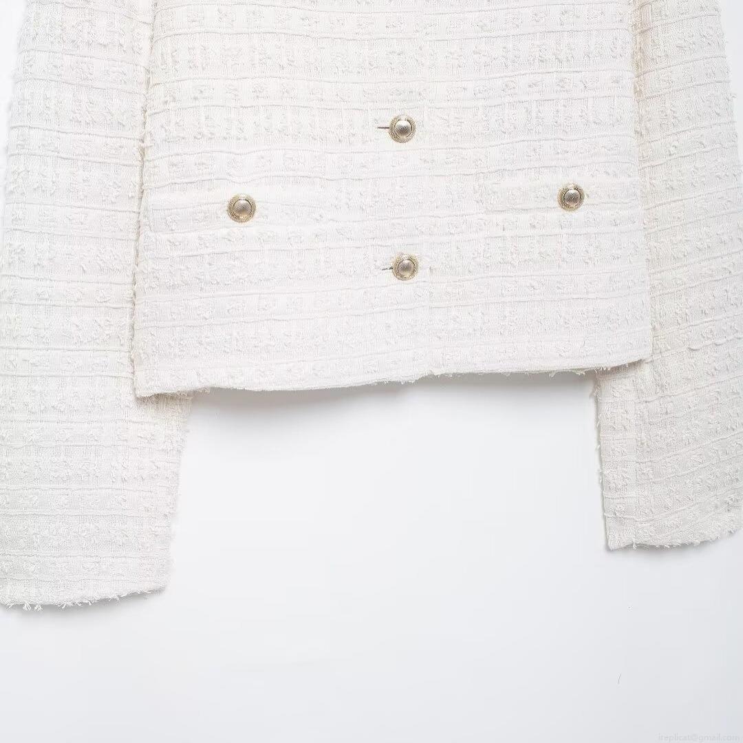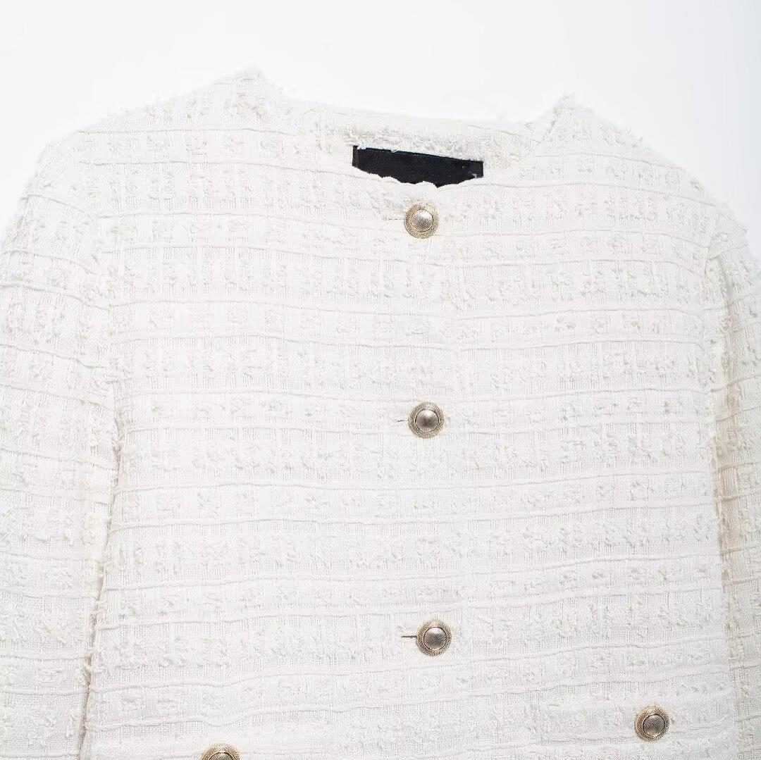 Women's Elegant White Tweed Jacket Cropped Round Neck Long Sleeve Gold Button Outerwear For Office Party Lady Vintage Slim Fit Coat
