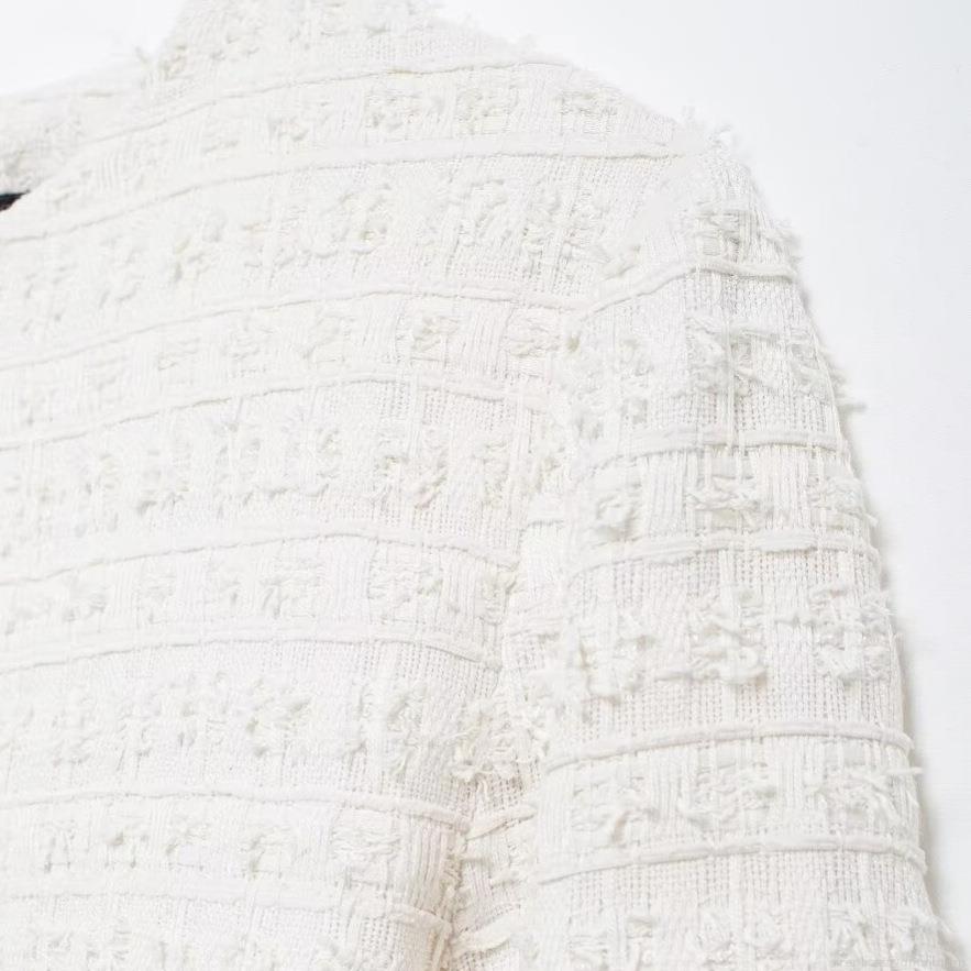 Solid Color, Tweed, Crew Neck, Woven Texture, Tassel Edges, Metal Gold Buttons