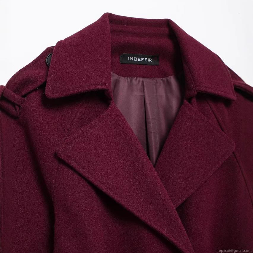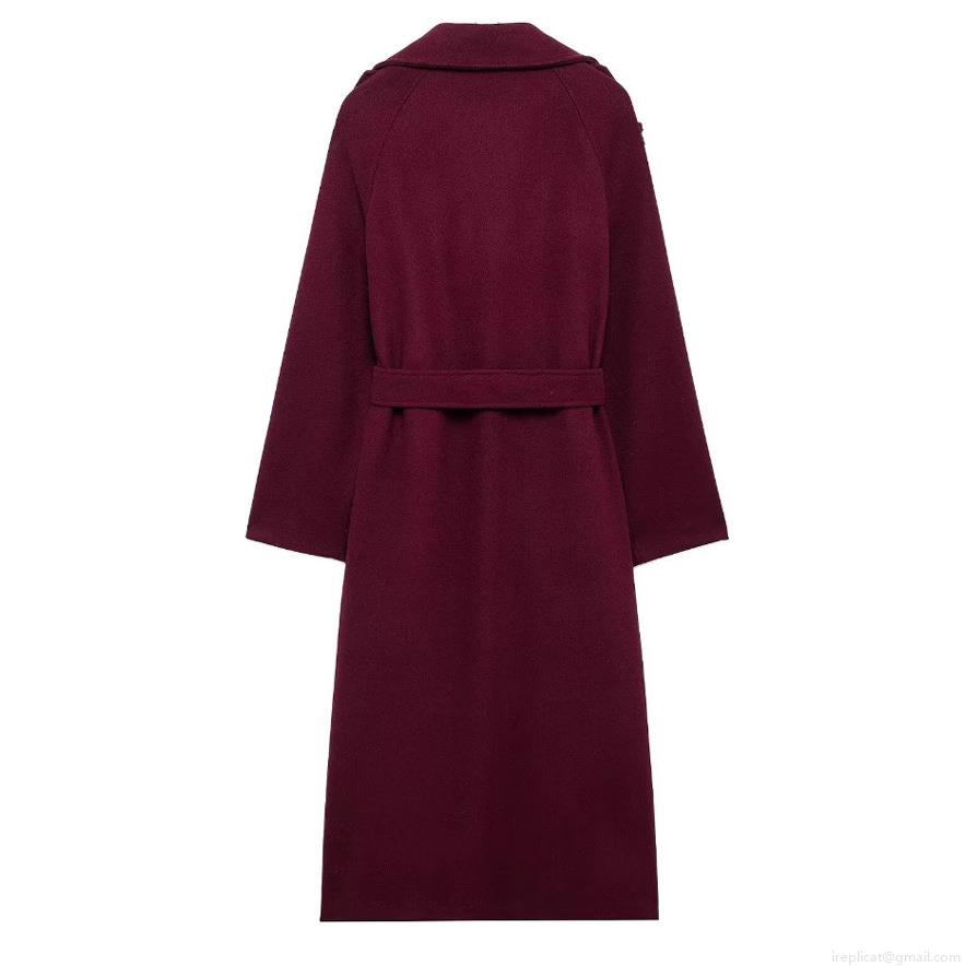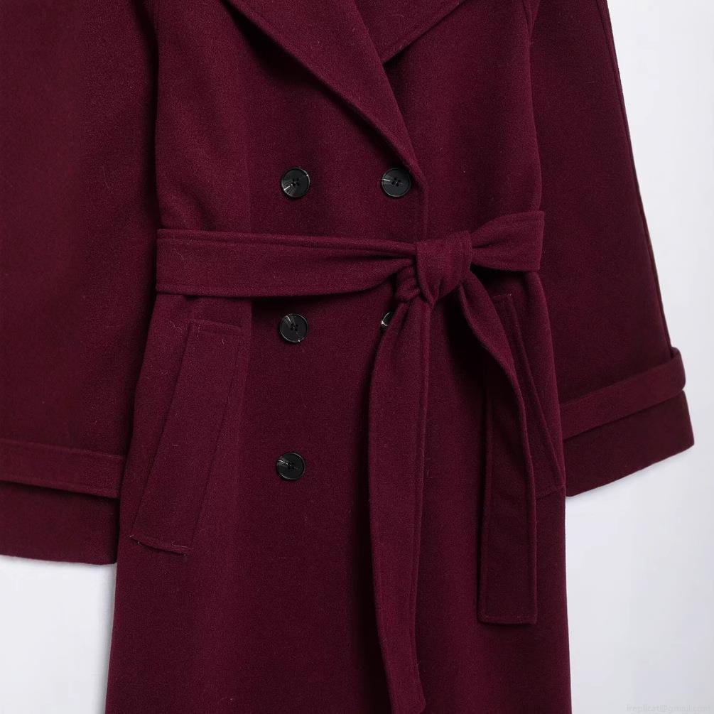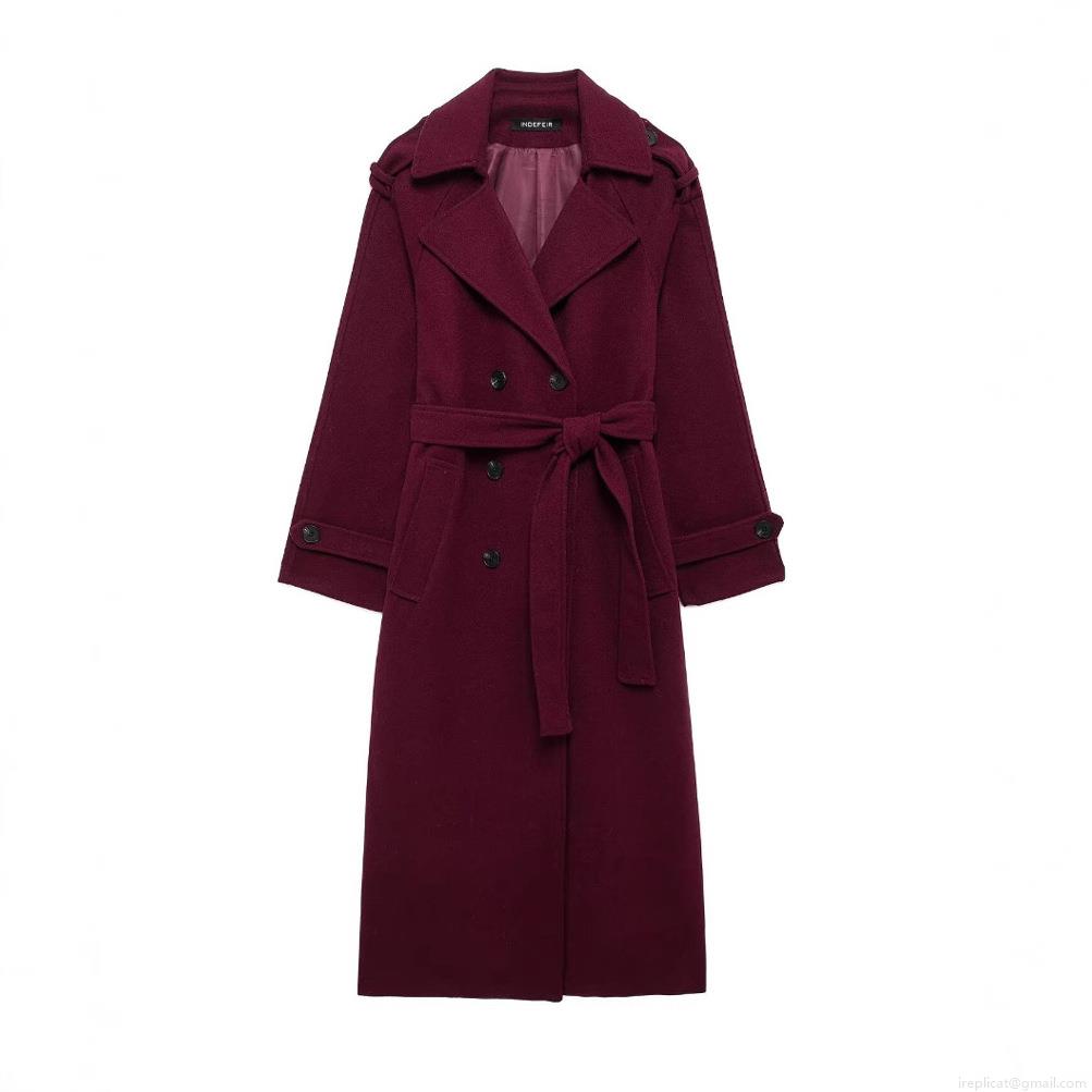 • Women's Elegant Wine Red Woolen Style Coat Double Breasted Long Sleeve Overcoat With Waist Belt Commute Fashion Minimalist Winter Outwear