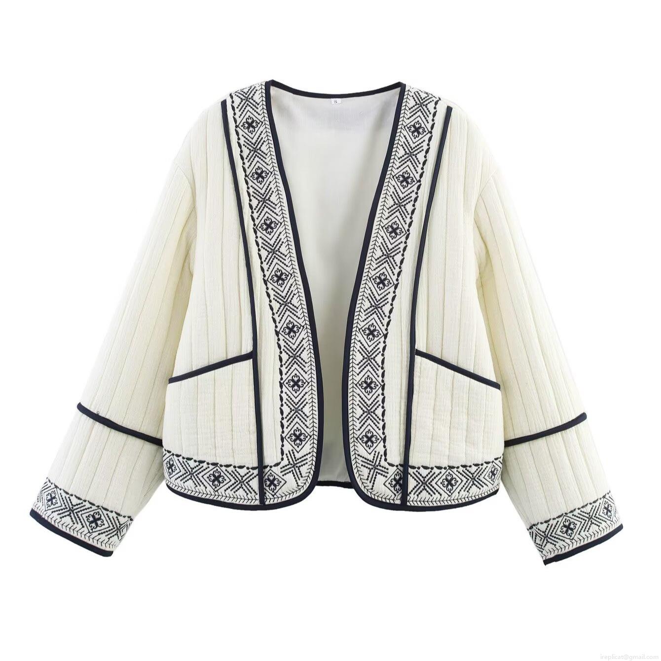 Women's Ethnic Embroidery Quilted Jacket Bohemian Geometric Pattern Open Front Cotton Short Coat Casual Loose Outerwear For Women