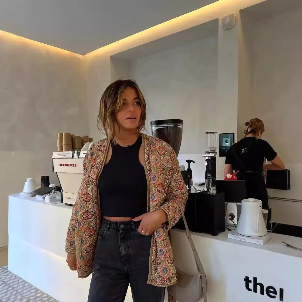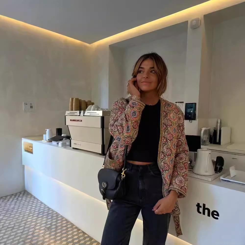 • Women's Ethnic Floral Print Quilted Jacket Long Sleeve Mid-Length Belted Coat With Pockets Bohemian Retro Style 100% Polyester Outerwear Fall Winter