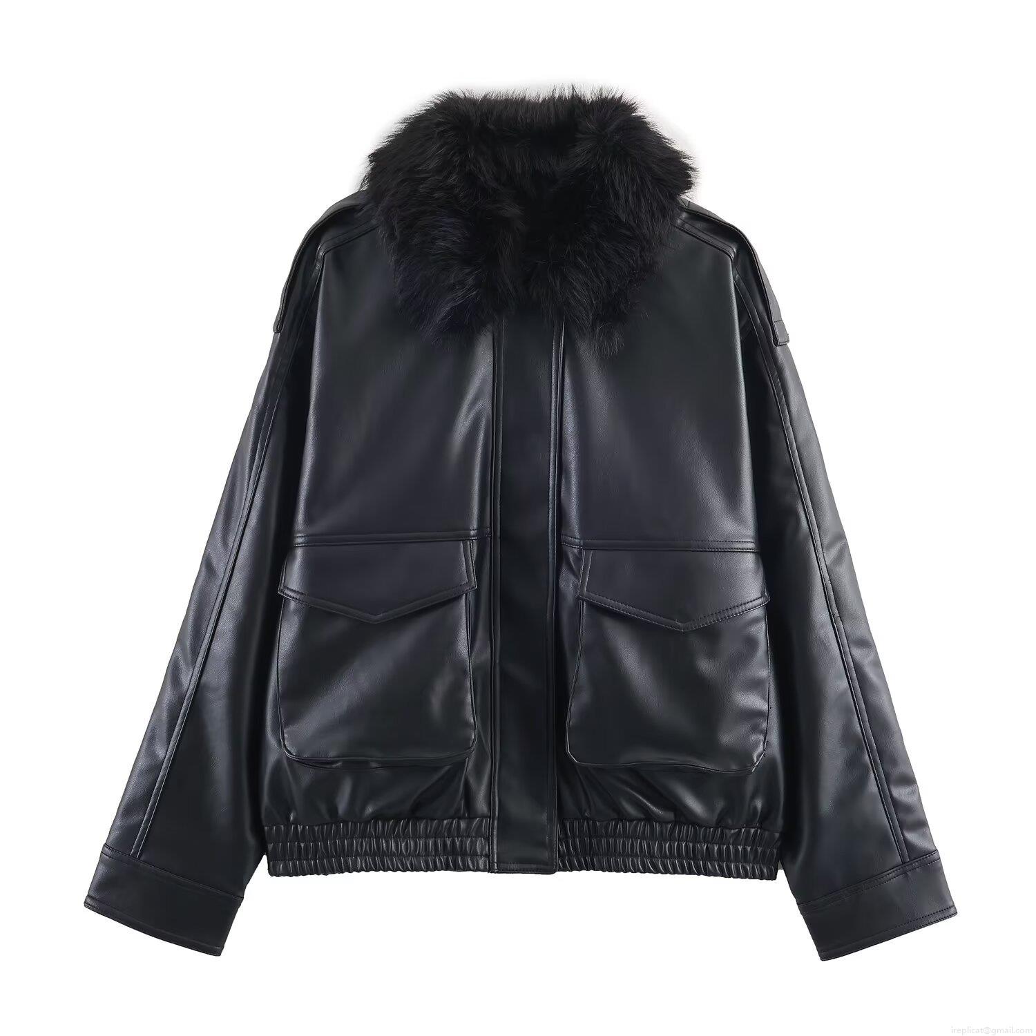 • Women's European American Style Loose Faux Leather Jacket With Detachable Fur Collar Autumn Winter Casual PU Biker Coat Long Sleeve Zip Up Streetwear Solid Black Outerwear