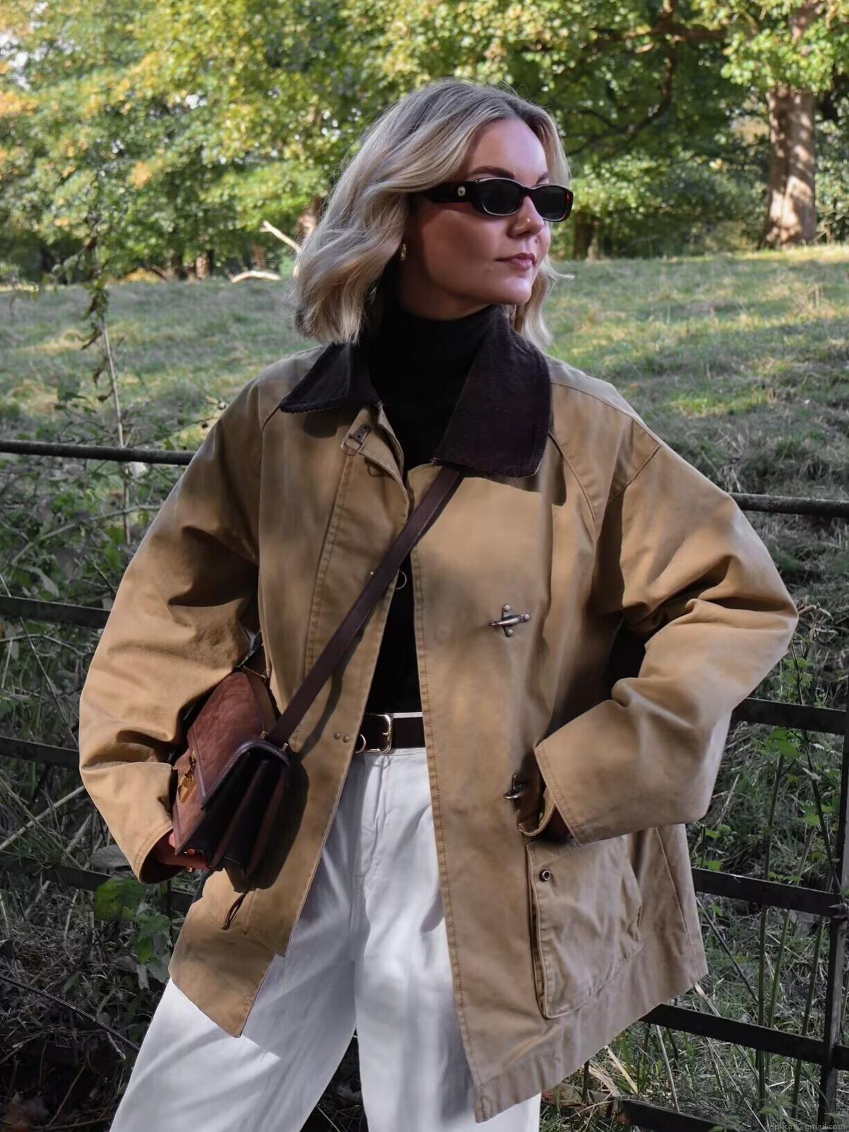 • Women's European Fashion Workwear Jacket Coat With Corduroy Contrast Collar Long Sleeve Zipper Polyester Canvas Style Outerwear Casual Street Streetwear Top
