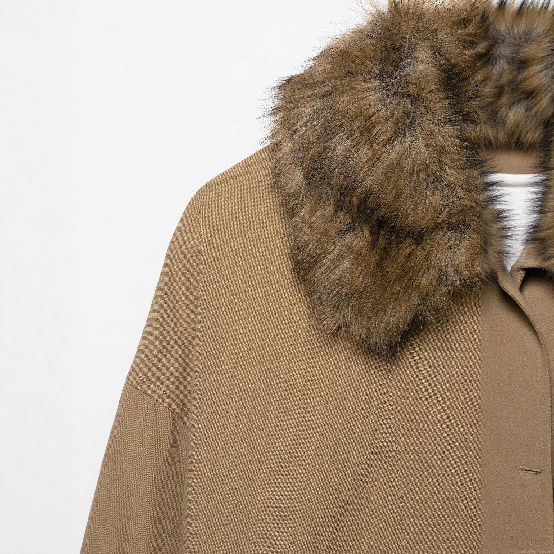 Women's European Style Khaki Faux Fur Collar Jacket Streetwear Baseball Uniform Solid Color Long Sleeve Outerwear For Autumn Winter