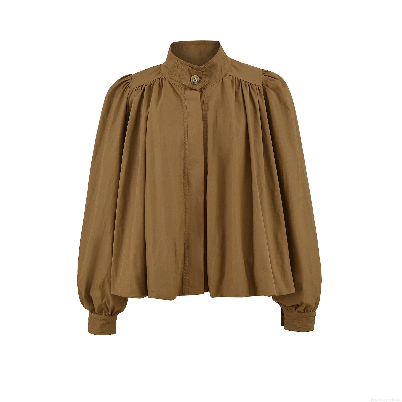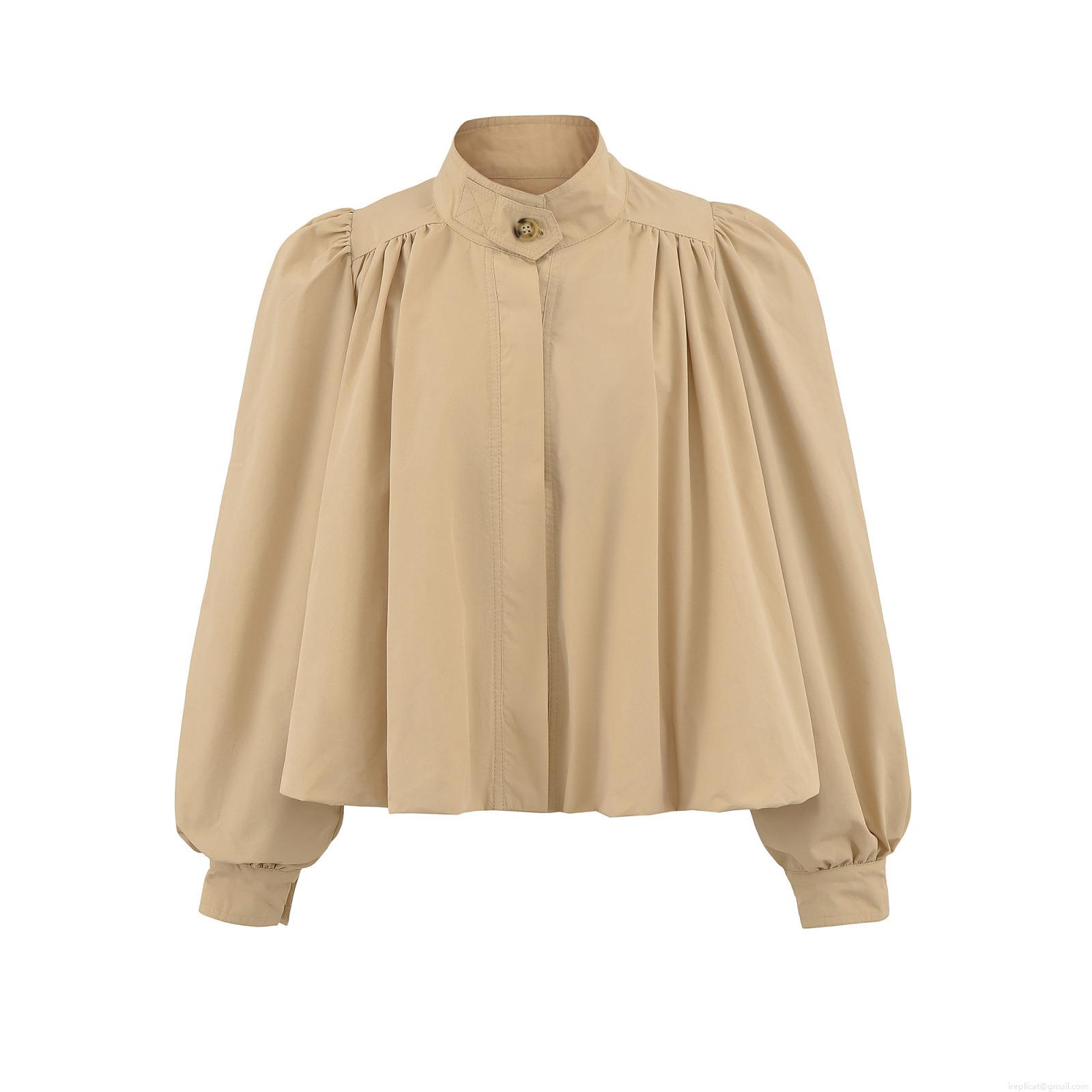 Women's European Style Pleated Stand Collar Jacket Lantern Sleeve Solid Color Cotton Nylon Blend Autumn Loose Casual Coat For Daily Streetwear Fashion