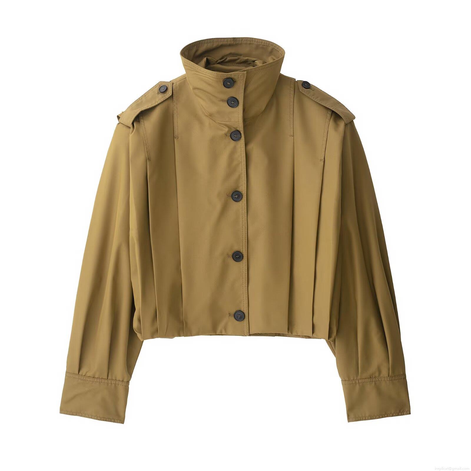 Women's European Style Streetwear Jacket With Lapel Collar Epaulettes Pleated Sleeves Single Breasted Short Coat 100% Polyester