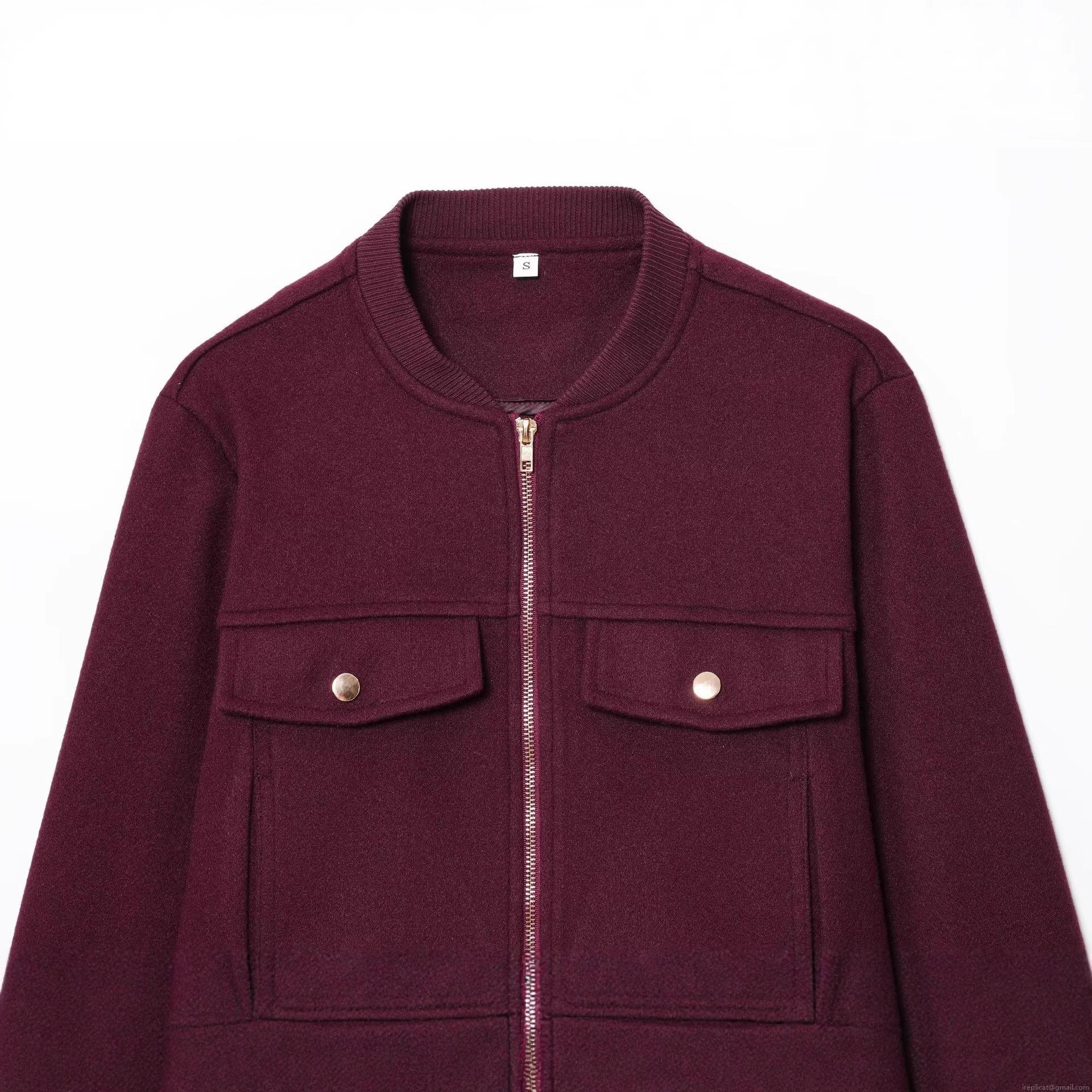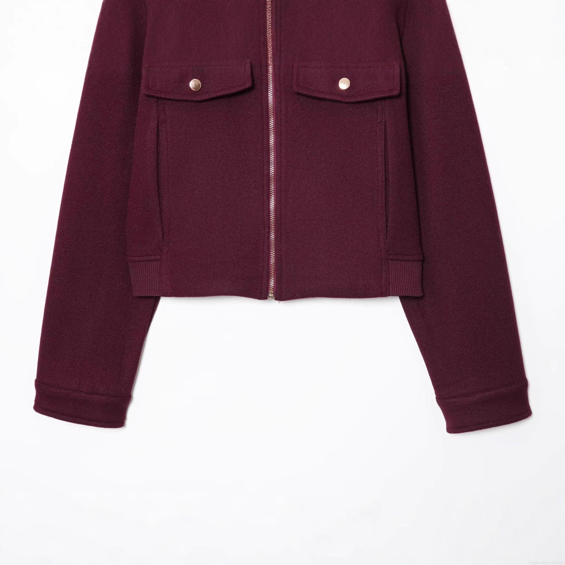 • Women's Fashion Burgundy Short Woolen Jacket Zip Up Casual Bomber Outwear With Flap Pockets Elegant Stand Collar Long Sleeve Coat For Daily Commute Ladies