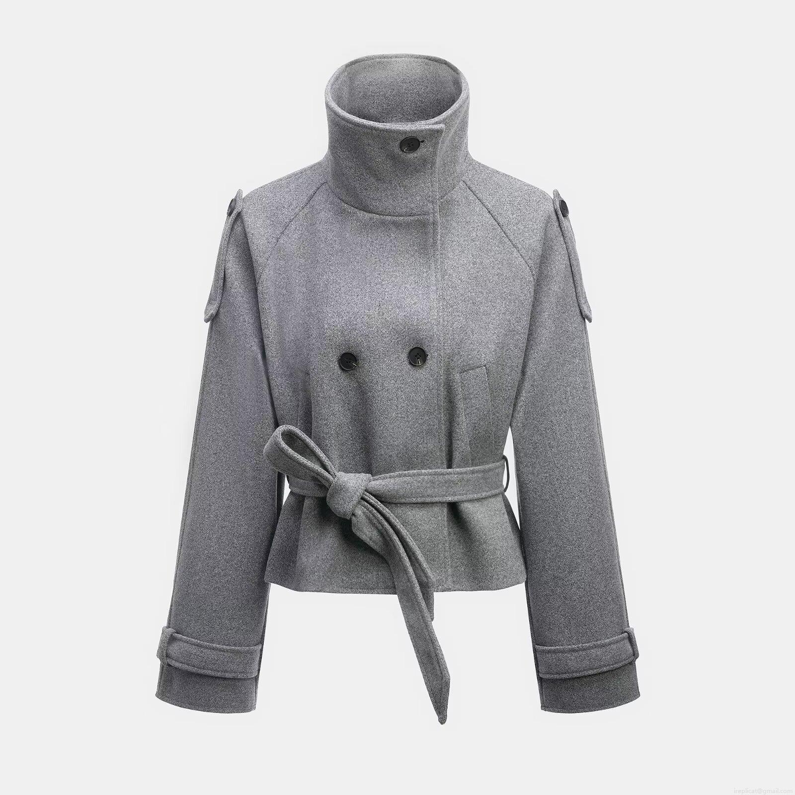 • Women's Fashion Casual Double Breasted Short Woolen Jacket With Waist Belt And Epaulettes Solid Color Long Sleeve Lapel Outerwear Coat For Autumn Winter