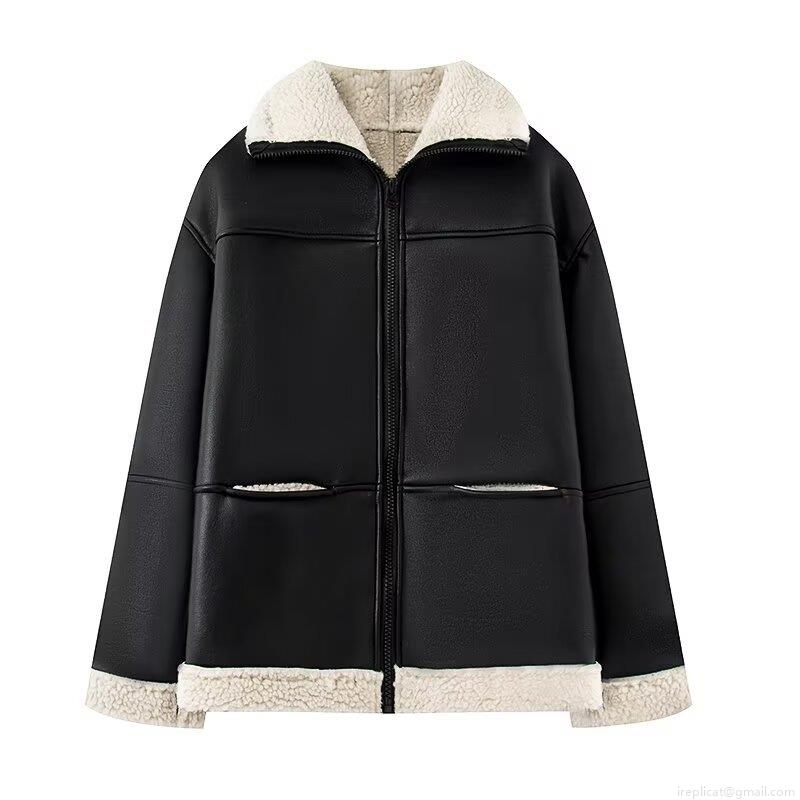• Women's Fashion Casual Faux Leather Shearling Integrated Jacket Contrast Color Lapel Loose Mid-length Warm Winter Coat With Faux Fur Lining For Women