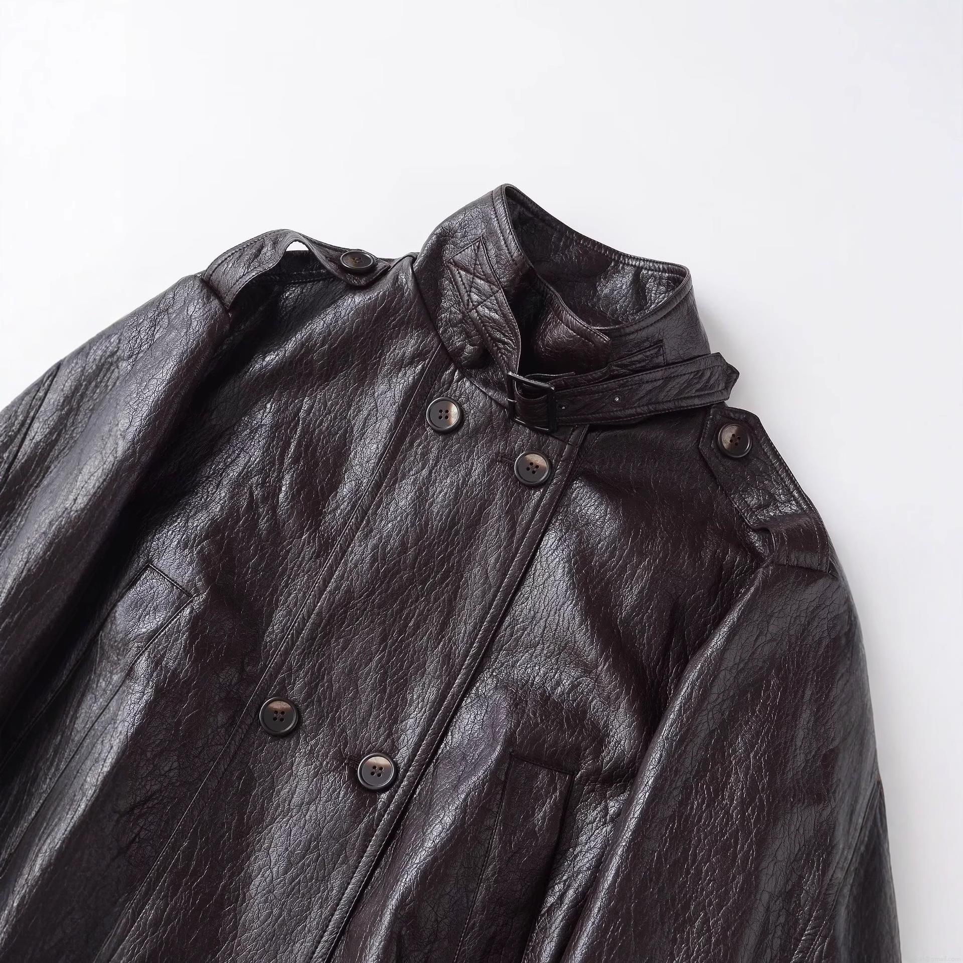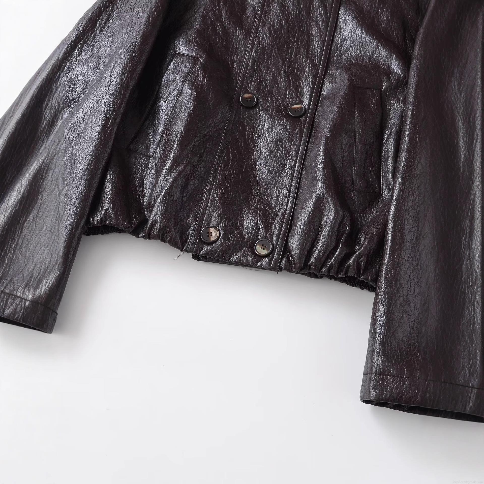 • Women's Fashion Casual PU Leather Jacket Stand Collar Double Breasted Zipper Outerwear With Shoulder Tabs Wrinkle Texture Streetwear For Women