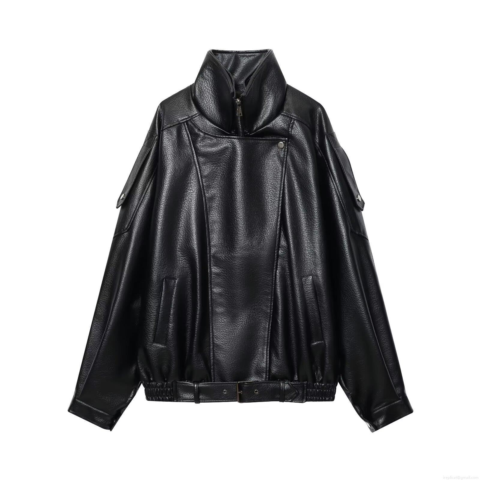 Women's Fashion Casual PU Leather Jacket With Belt Chic Double Collar Slim Motorcycle Biker Coat Windproof Outerwear For Ladies Vintage Streetwear
