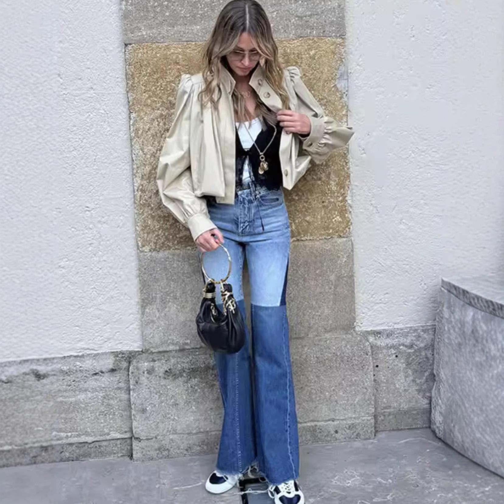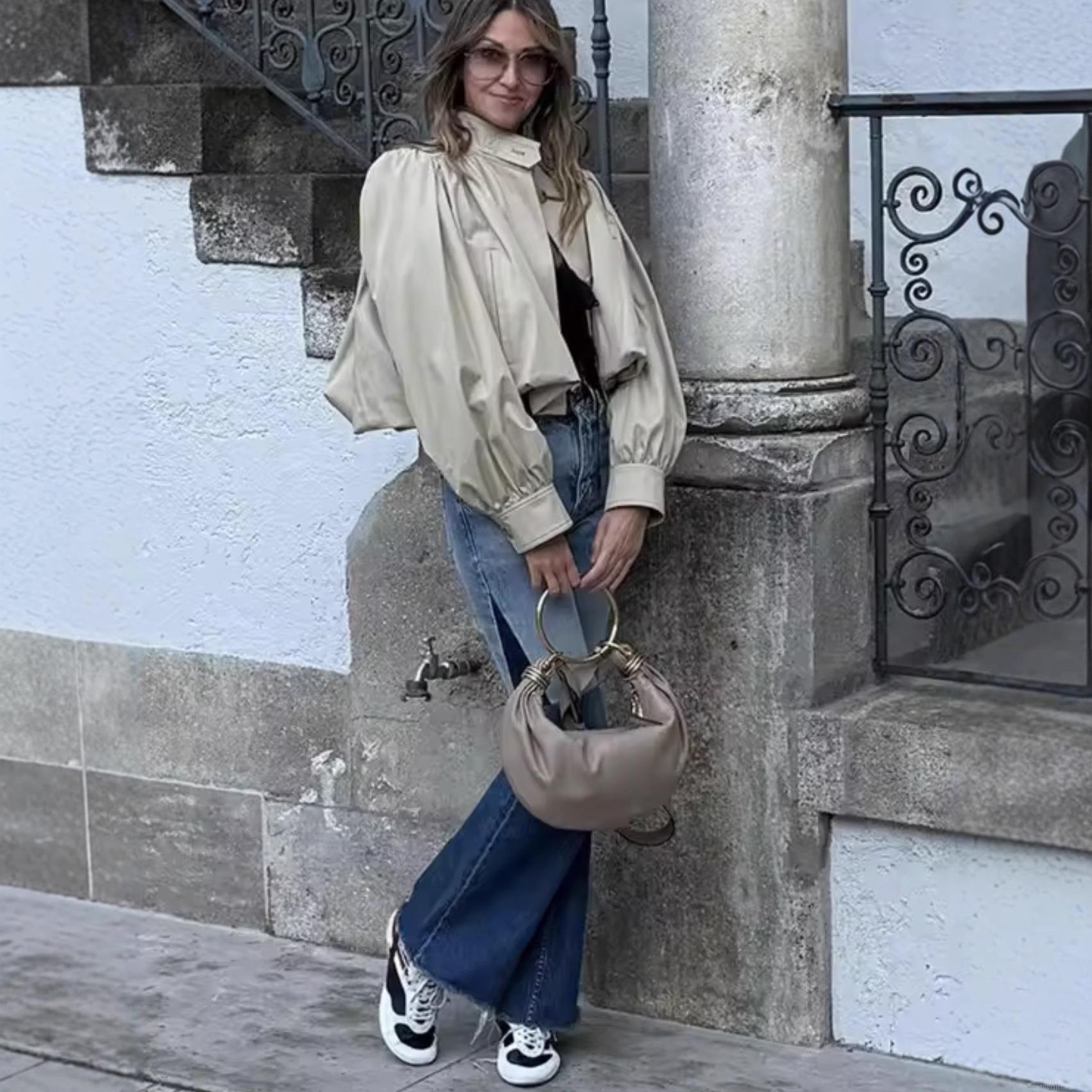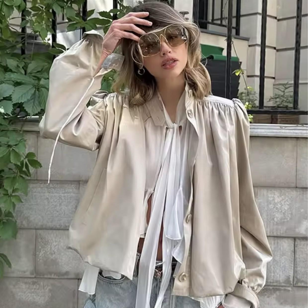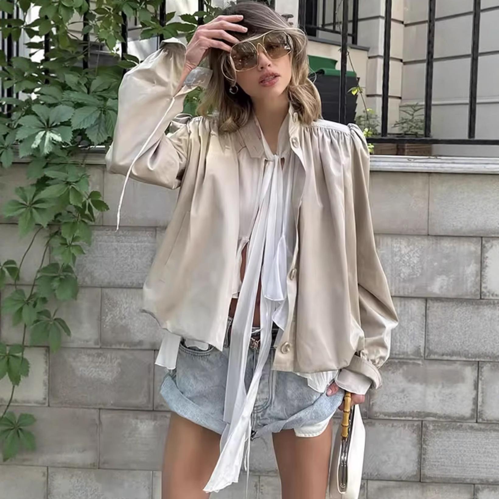 • Women's Fashion Casual Stand Collar Pleated Bubble Sleeve Short Jacket Elegant Single Breasted Polyester Outerwear For Women Spring Autumn Daily Wear