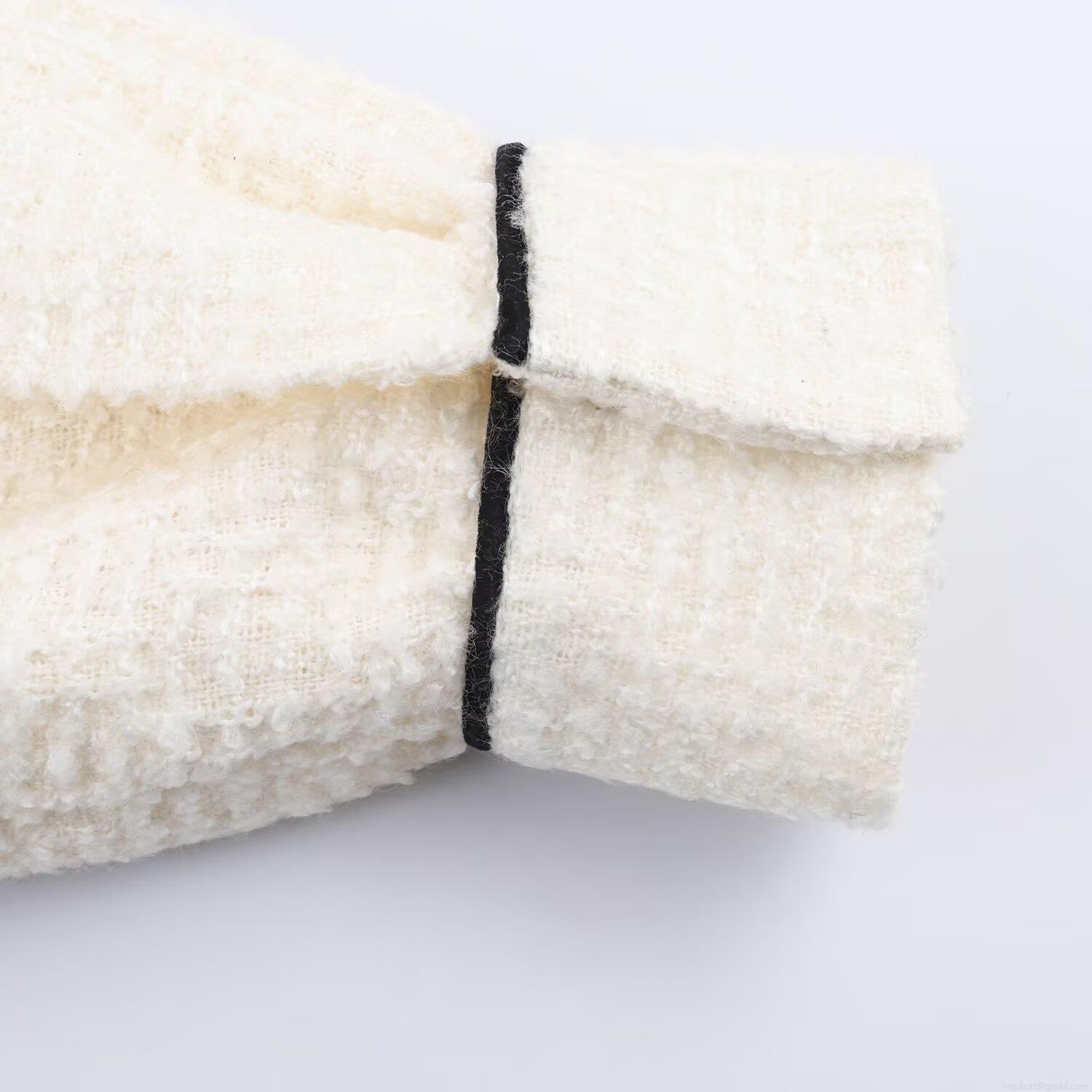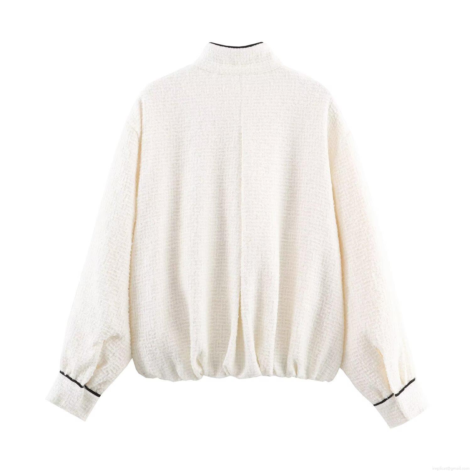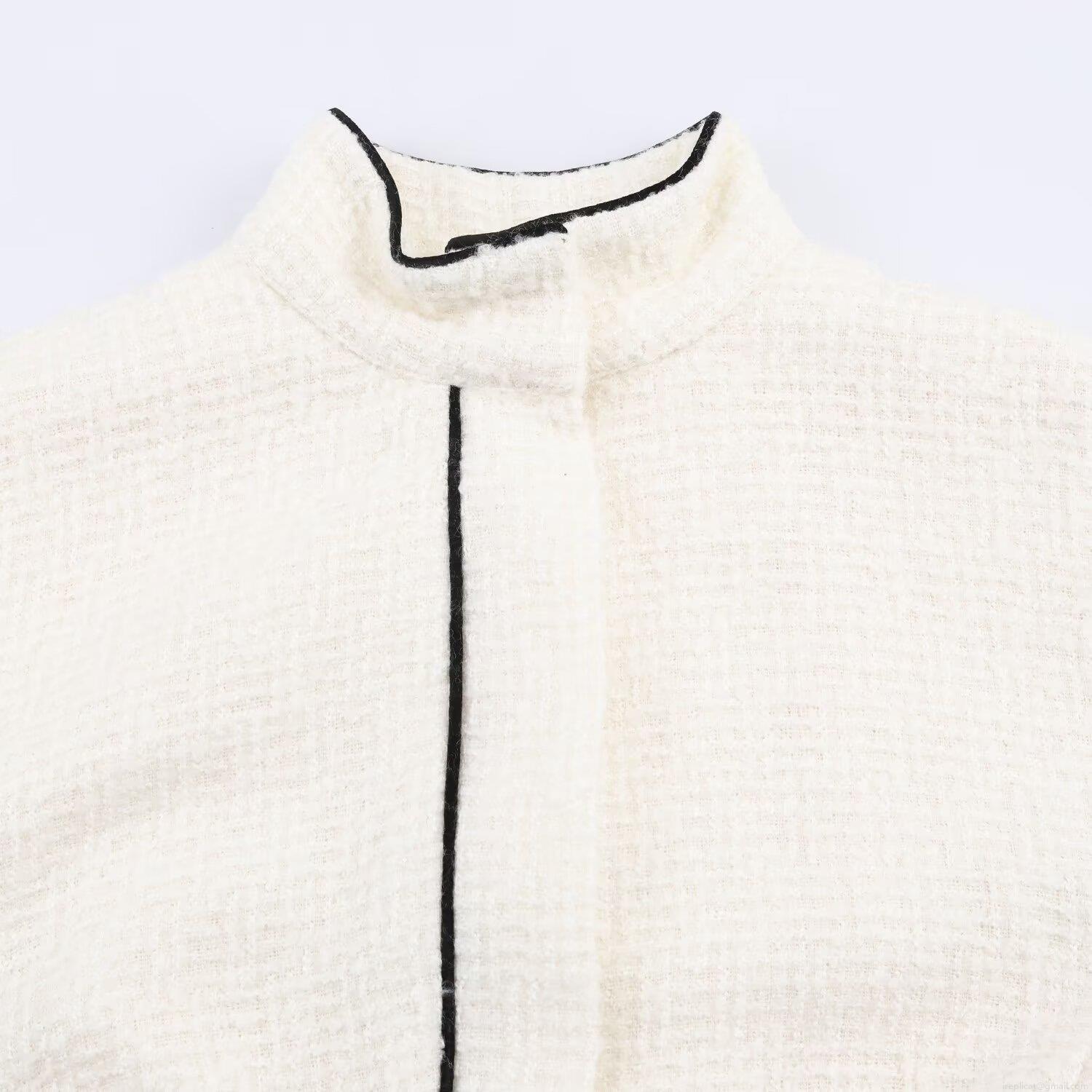 • Women's Fashion Contrasting Trim Bomber Jacket Tweed Textured Fabric Zipper Stand Collar Long Sleeve Casual Loose Outwear Coat For Winter Autumn