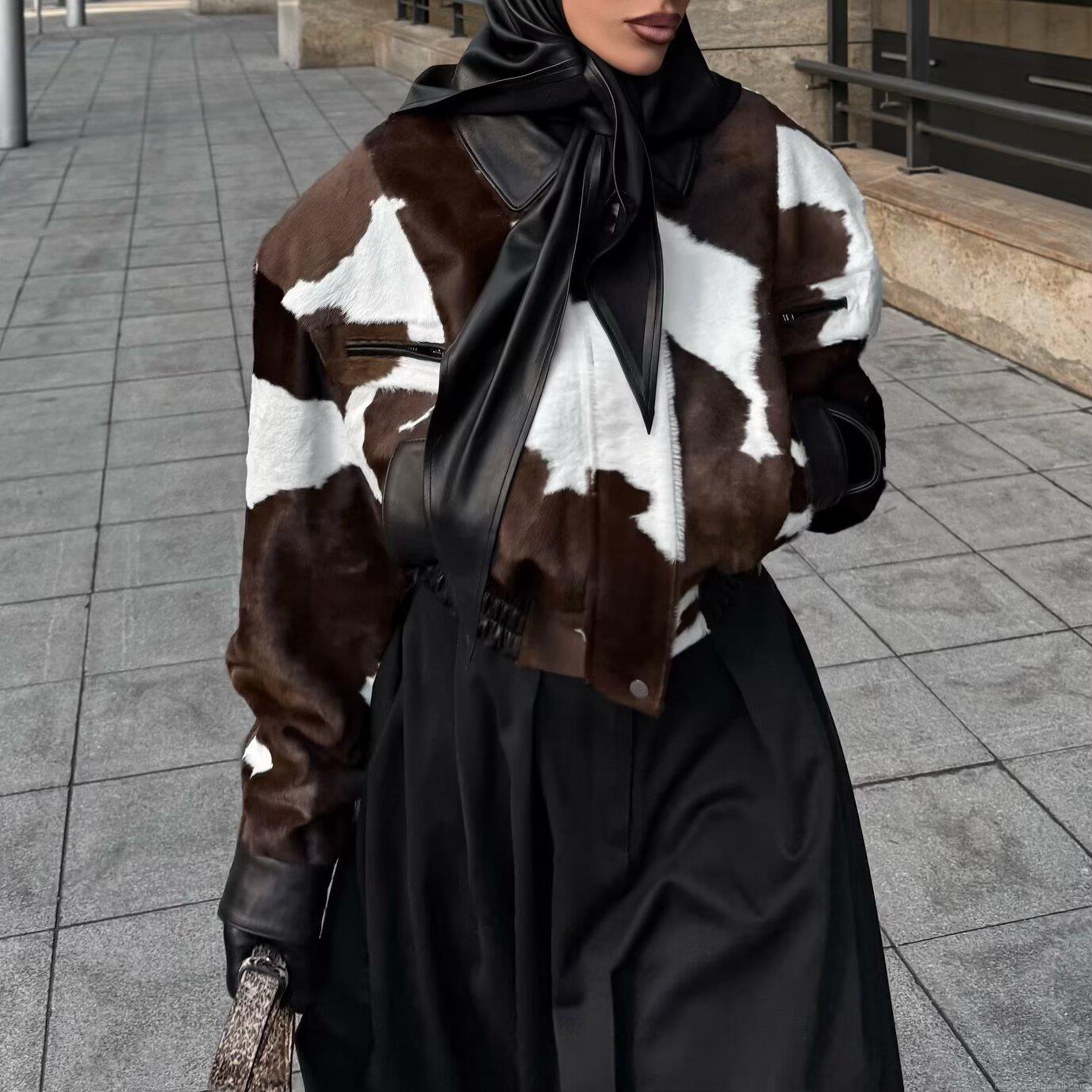 • Women's Fashion Cow Print Faux Fur Jacket With PU Leather Patchwork Street Style Lapel Short Coat Autumn Winter Thick Outwear
