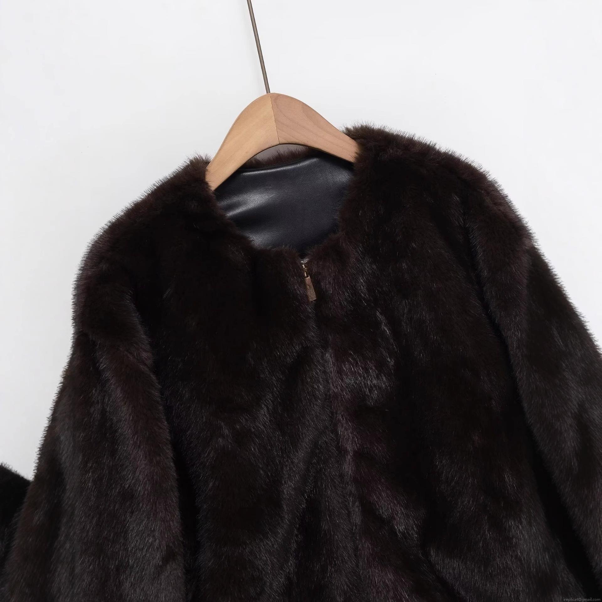 Women's Fashion Faux Fur Bomber Jacket Short Zip Up Winter Coat Deep Brown Solid Color Casual Plush Outwear For Ladies 100% Polyester Material