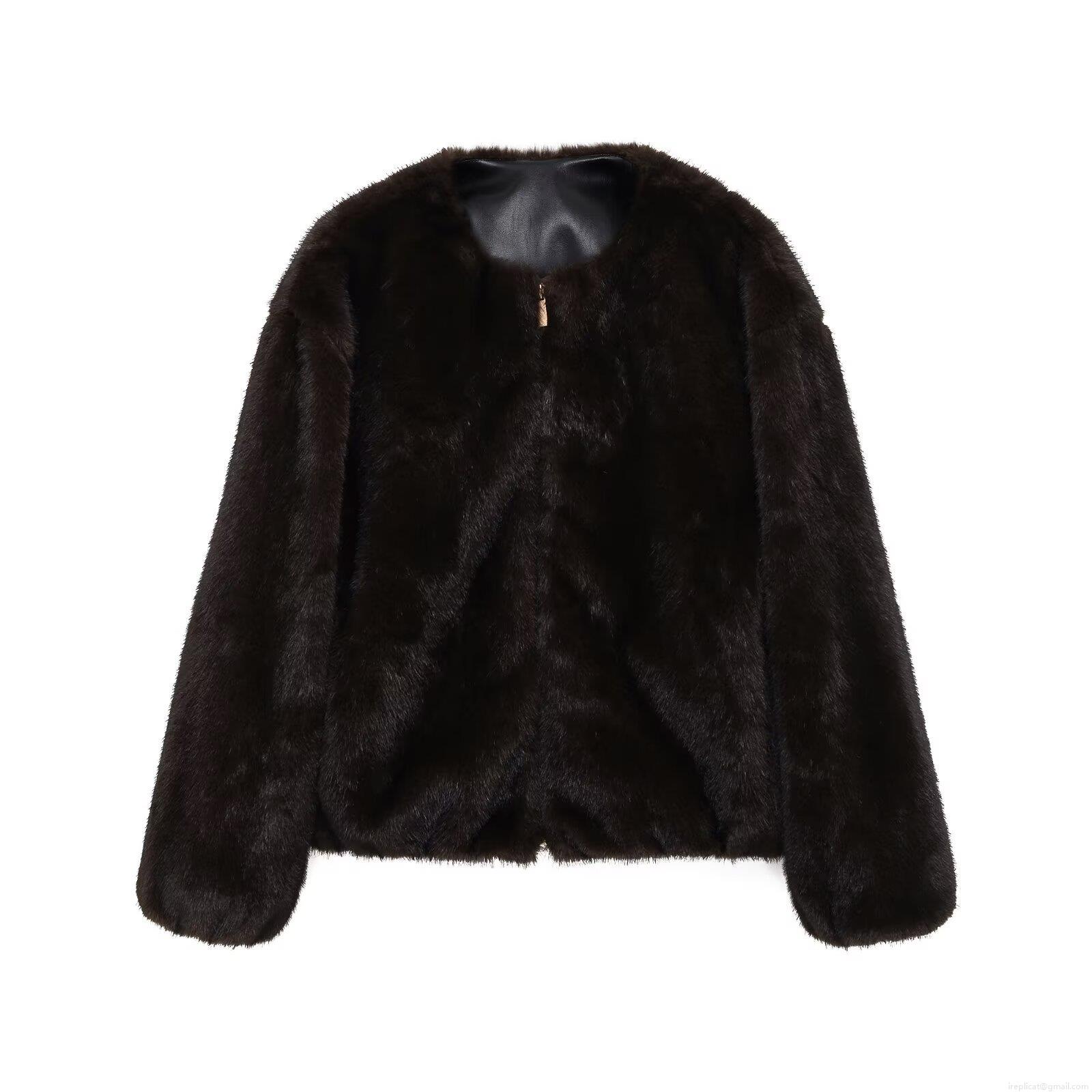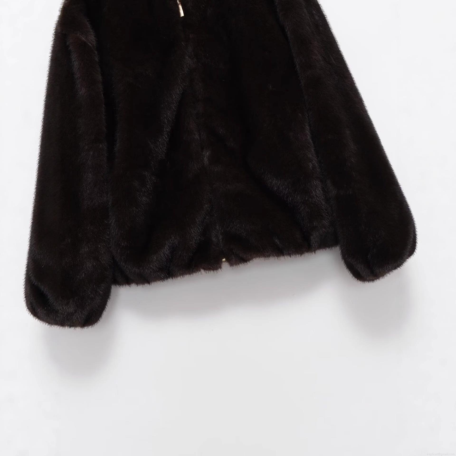 • Women's Fashion Faux Fur Bomber Jacket Short Zip Up Winter Coat Deep Brown Solid Color Casual Plush Outwear For Ladies 100% Polyester Material