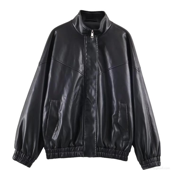 • Women's Fashion Faux Leather Bomber Jacket Solid Color Stand Collar Zip Up Windproof Moto Biker Outerwear Casual Streetwear Coat For Women