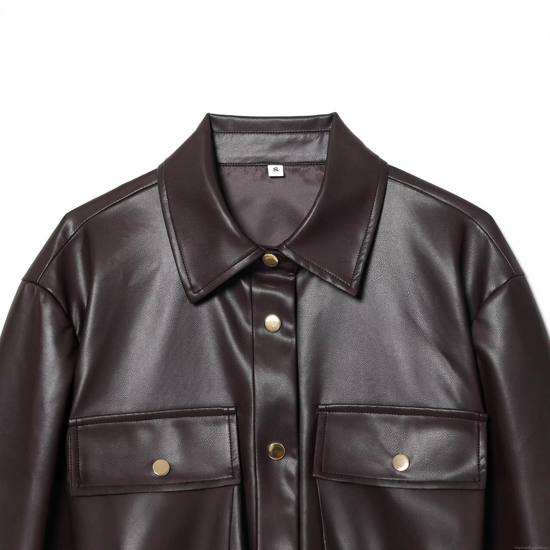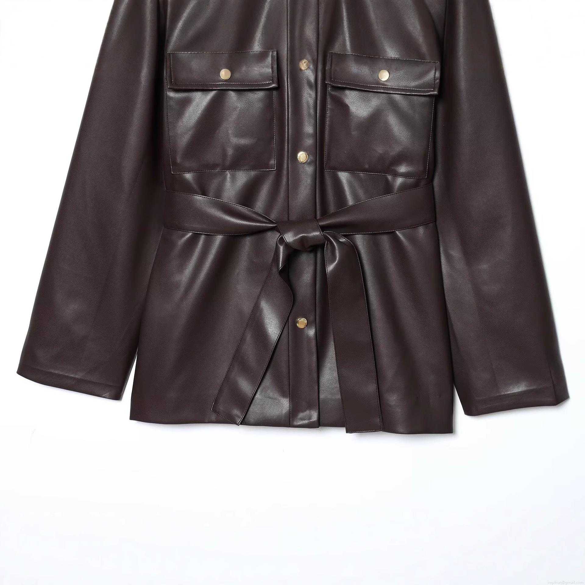 • Women's Fashion Faux Leather Long Jacket With Belt Chic Deep Brown PU Shacket Autumn Winter Casual Coat With Metal Buttons And Cargo Pockets For Ladies