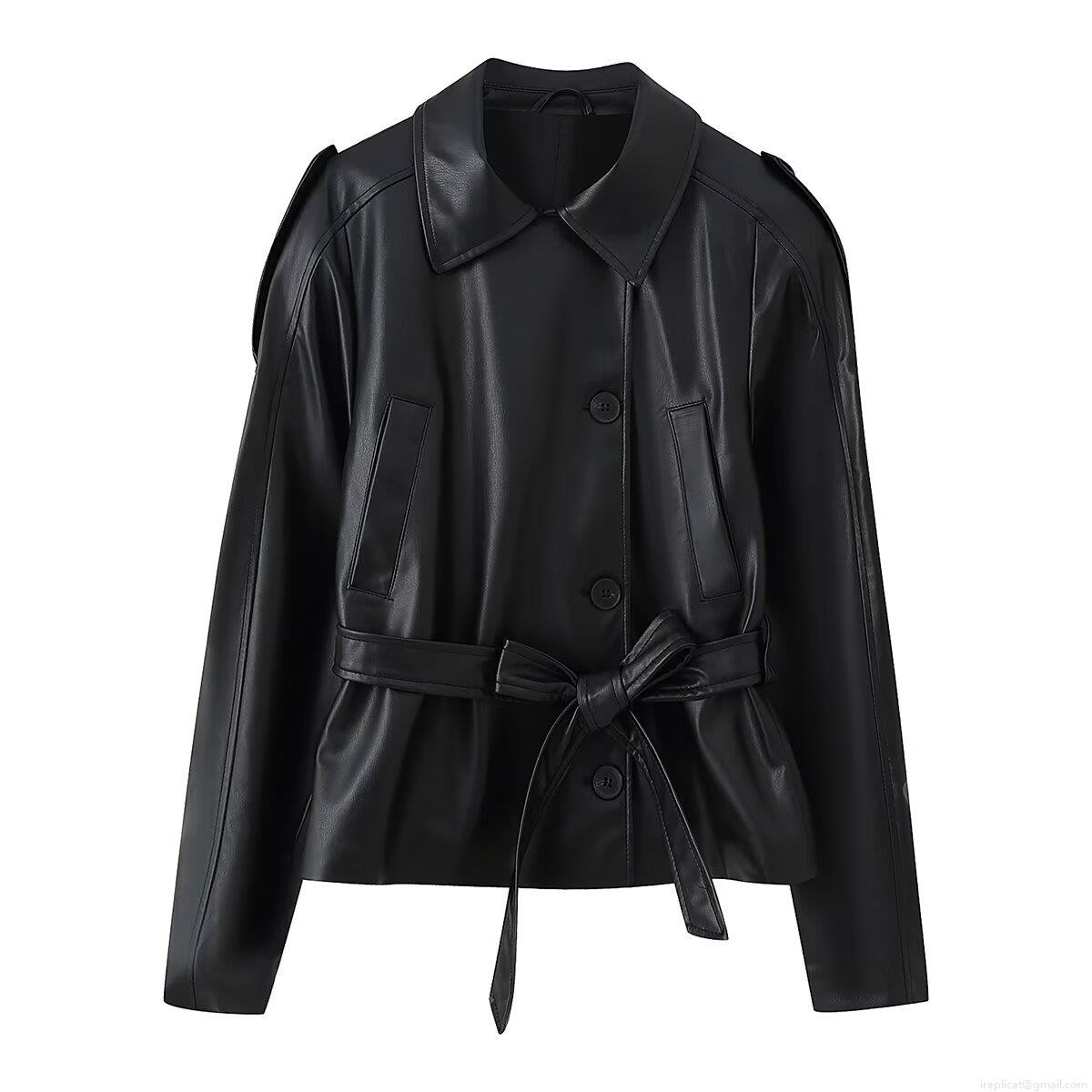 Women's Fashion Faux Leather Short Windbreaker Jacket PU Leather Polyester Single Breasted Belted Lapel Long Sleeve Coat For Daily Casual Elegant Outerwear