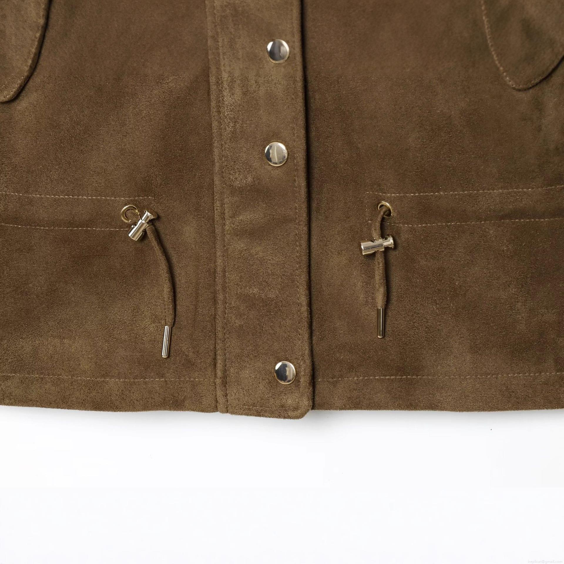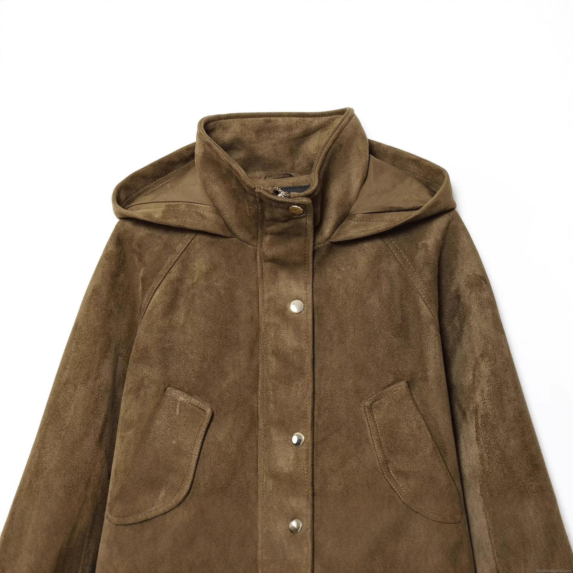 • Women's Fashion Faux Suede Hooded Jacket Elegant Casual Solid Color Long Sleeve Coat With Drawstring Hem And Metal Buttons