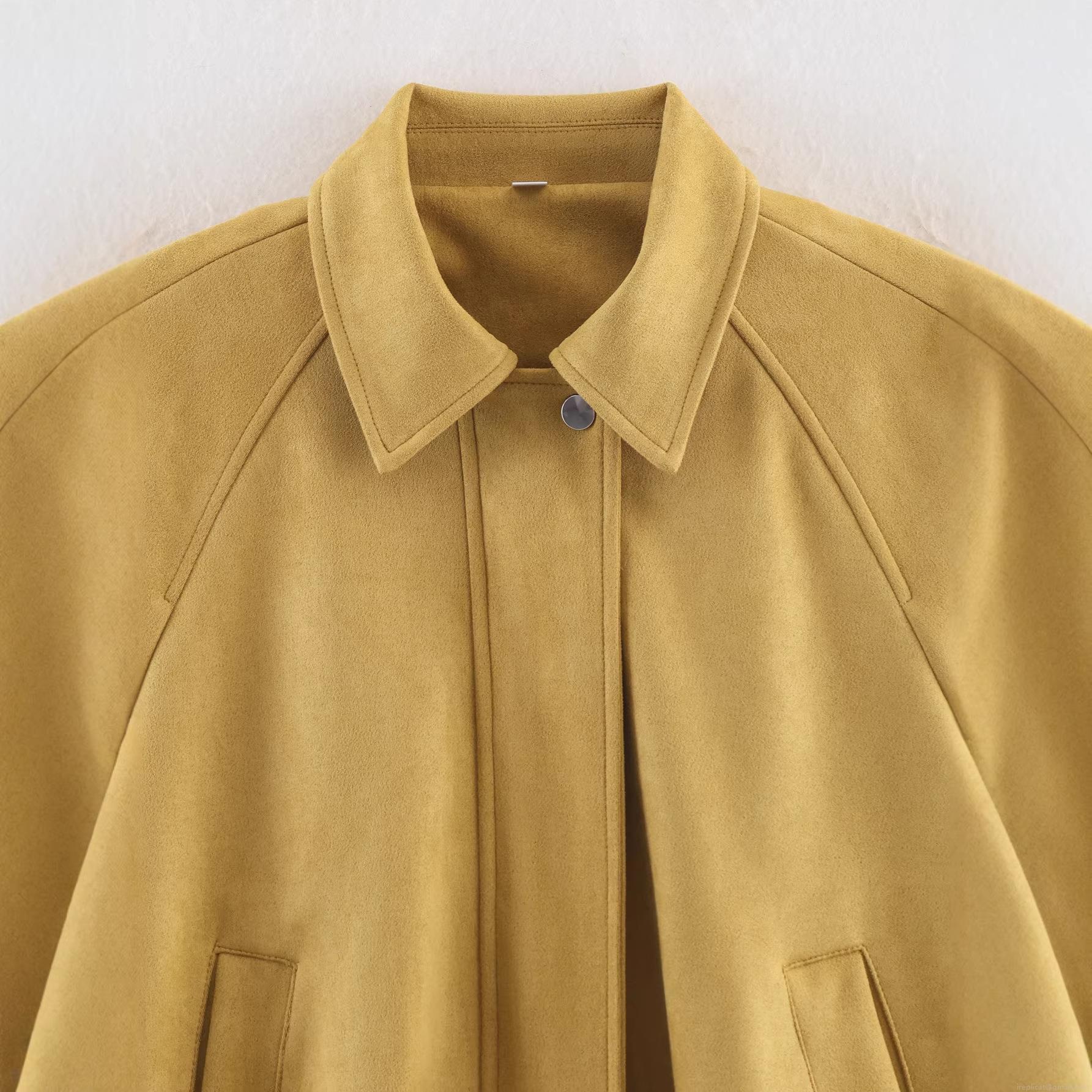 • Women's Fashion Faux Suede Jacket 100% Polyester Solid Color Casual Lapel Long Sleeve Short Coat With Snap Buttons And Pleated Hem For Spring Autumn Outwear