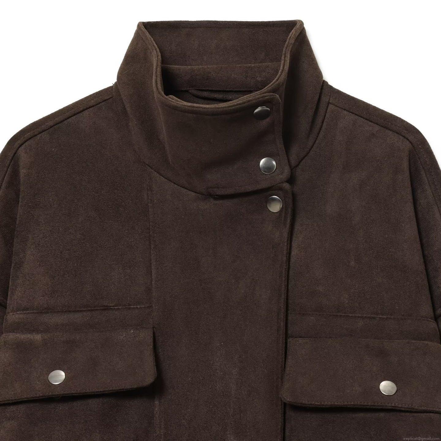 • Women's Fashion Faux Suede Jacket Casual Solid Color Stand Collar Long Sleeve Coat With Cargo Pockets And Metal Buttons For Fall Winter Daily Streetwear