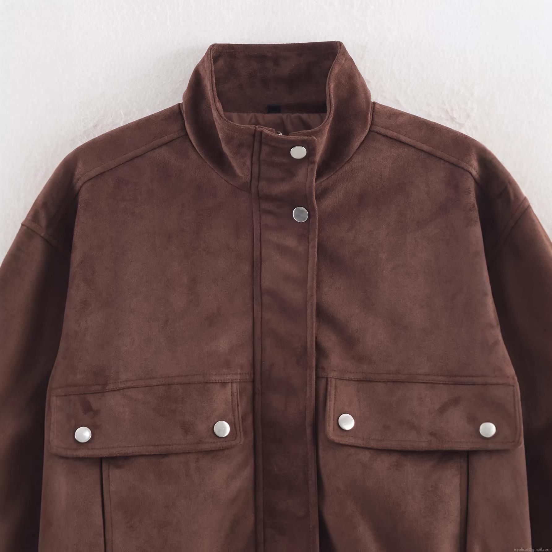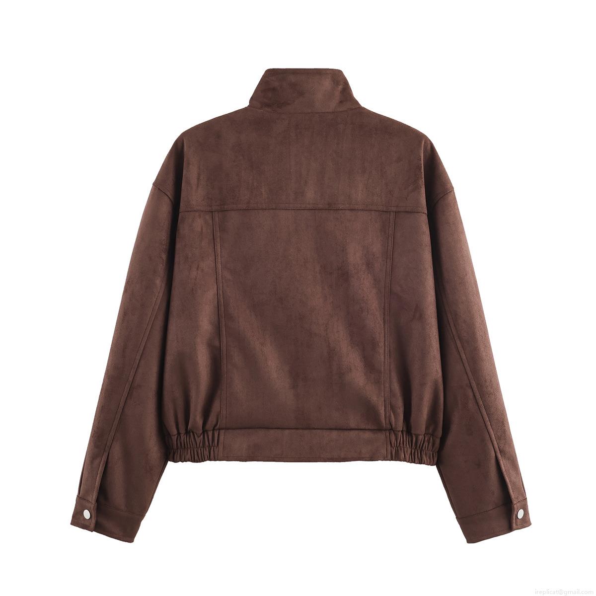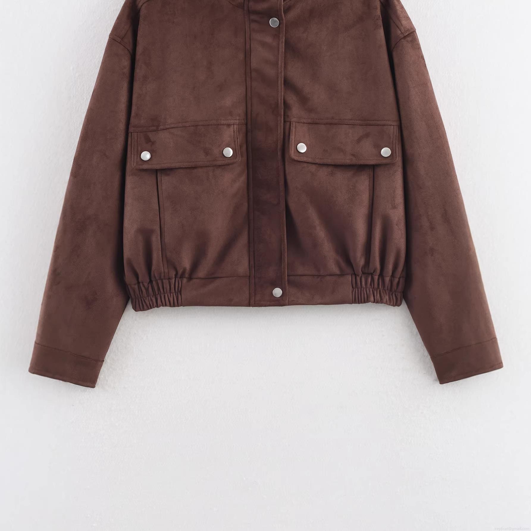• Women's Fashion Faux Suede Jacket Loose Fit Standing Collar Multi Pocket Elastic Hem Snap Button Polyester Short Coat Streetwear For Women Daily Casual Wear