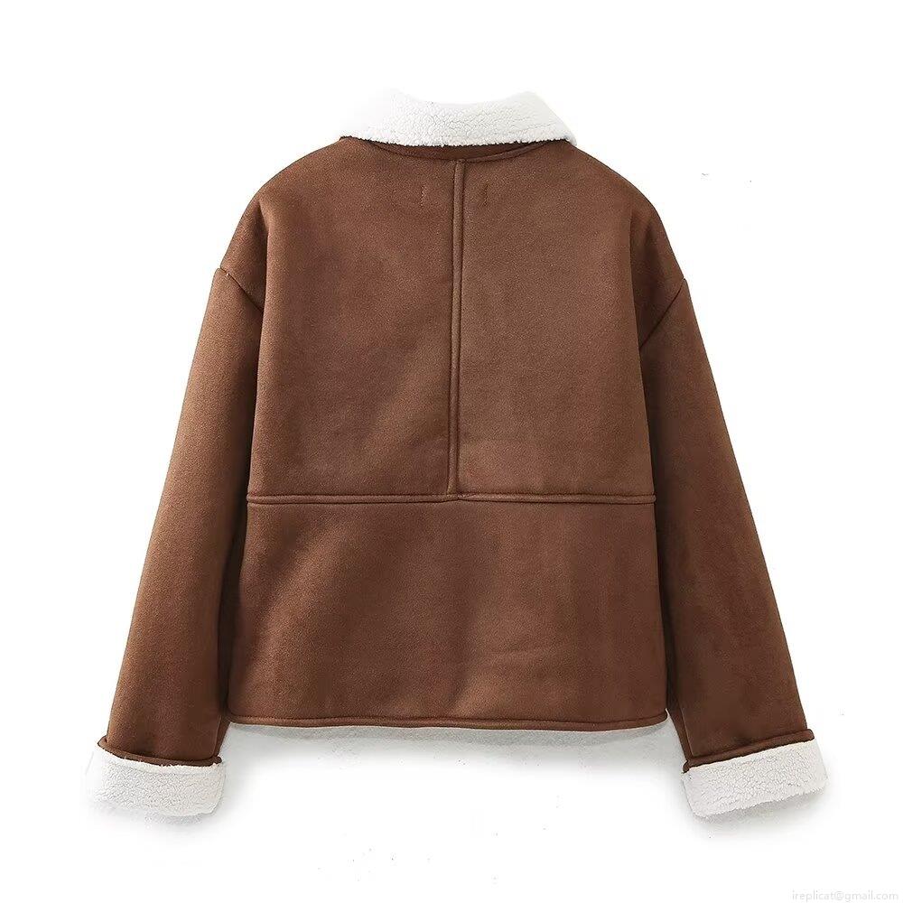 • Women's Fashion Faux Suede Patchwork Jacket With Faux Lamb Wool Collar Vintage Streetwear Button Down Coat With Patch Pockets For Autumn Winter