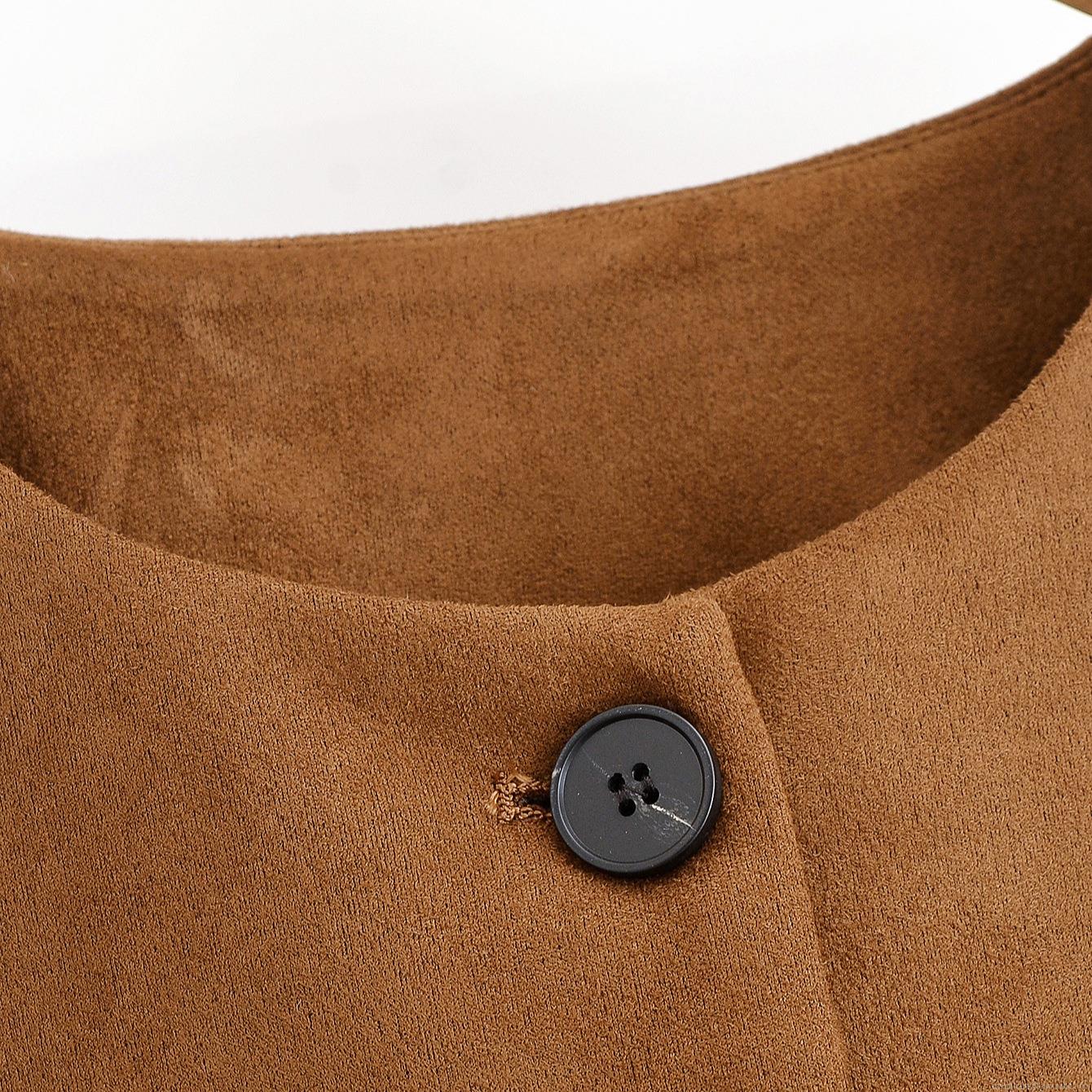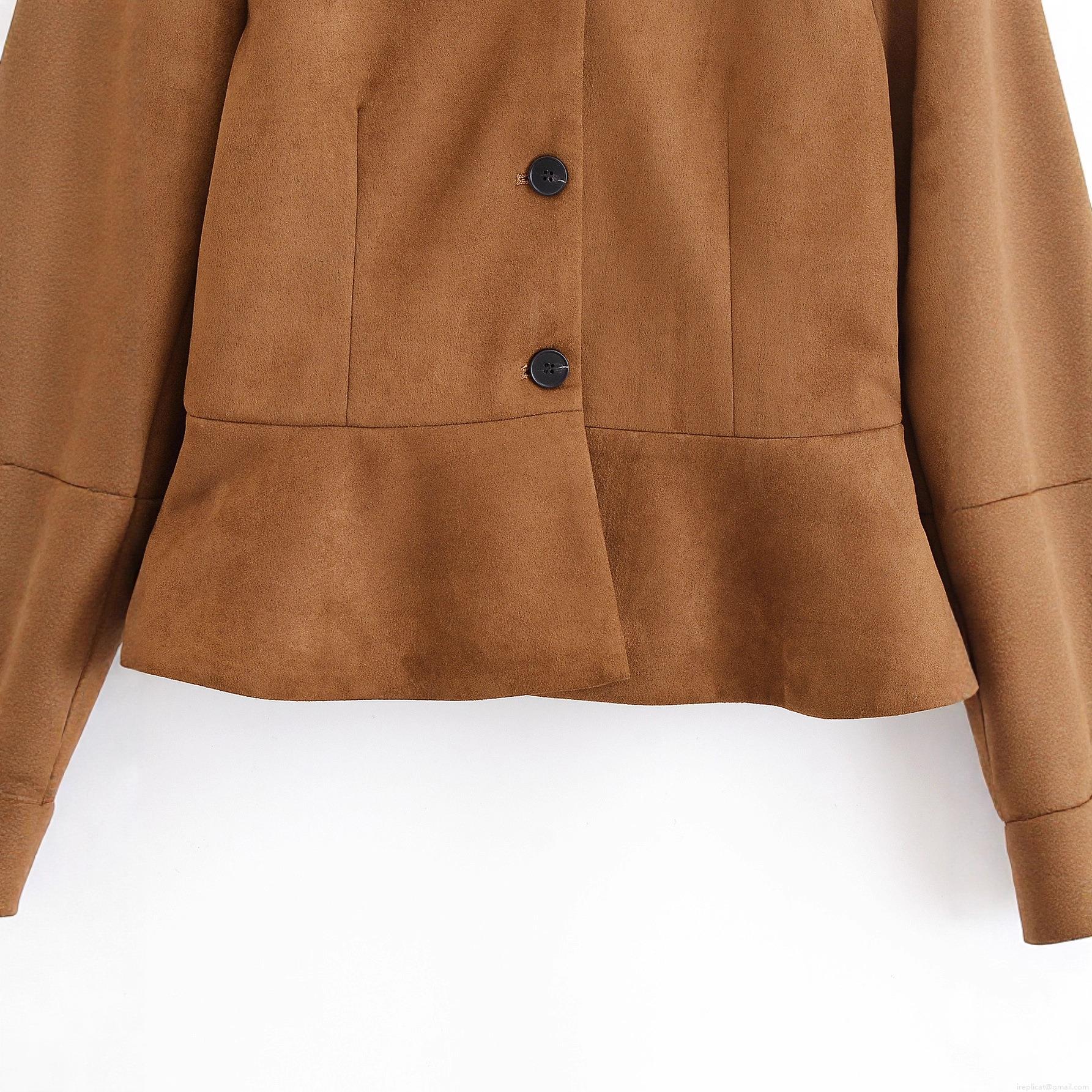• Women's Fashion Faux Suede Peplum Jacket Round Neck Single Breasted Short Coat Long Sleeve Slim Fit Ruffle Hem Outerwear 100% Polyester Dark Brown