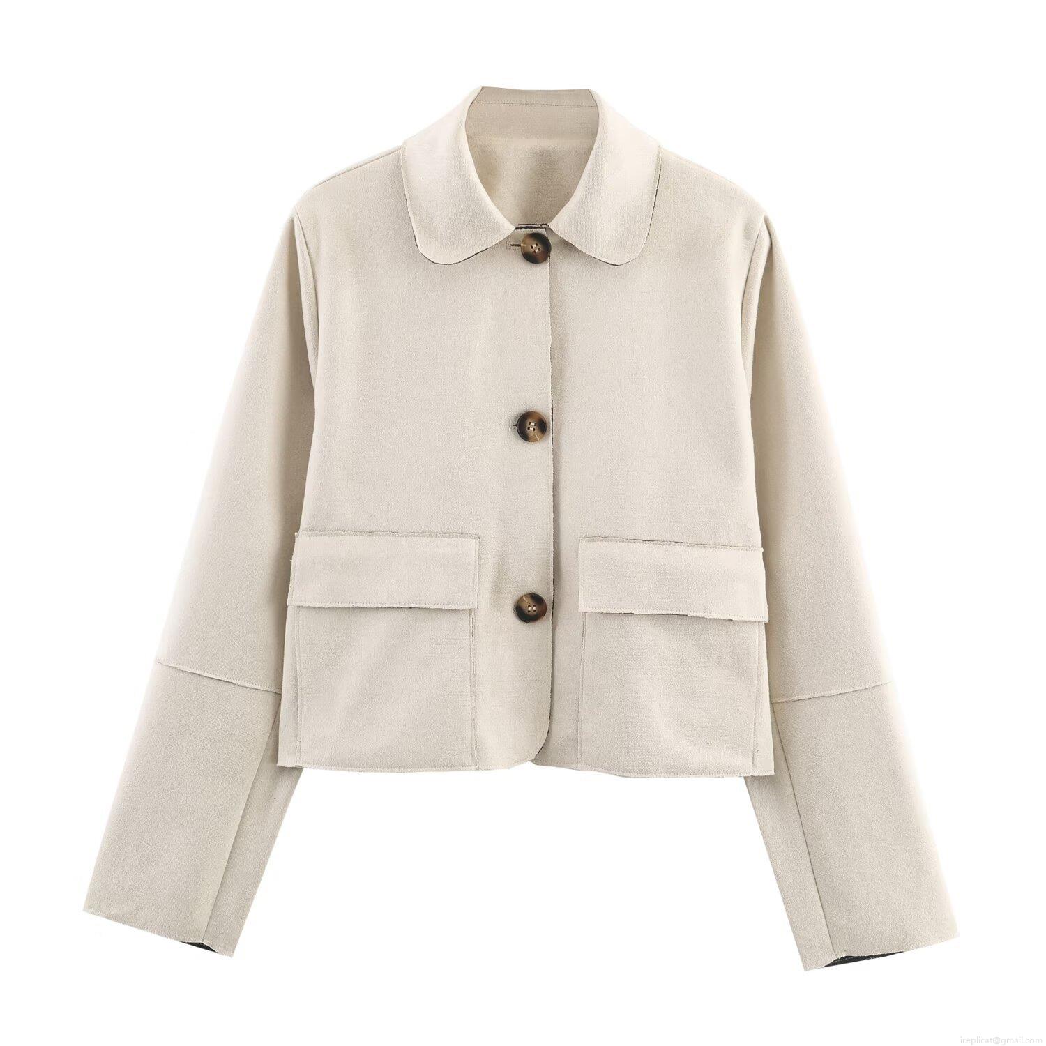 • Women's Fashion Faux Suede Short Jacket Lapel Single Breasted Long Sleeve Coat With Pockets Casual Solid Color Outerwear For Women Spring Autumn