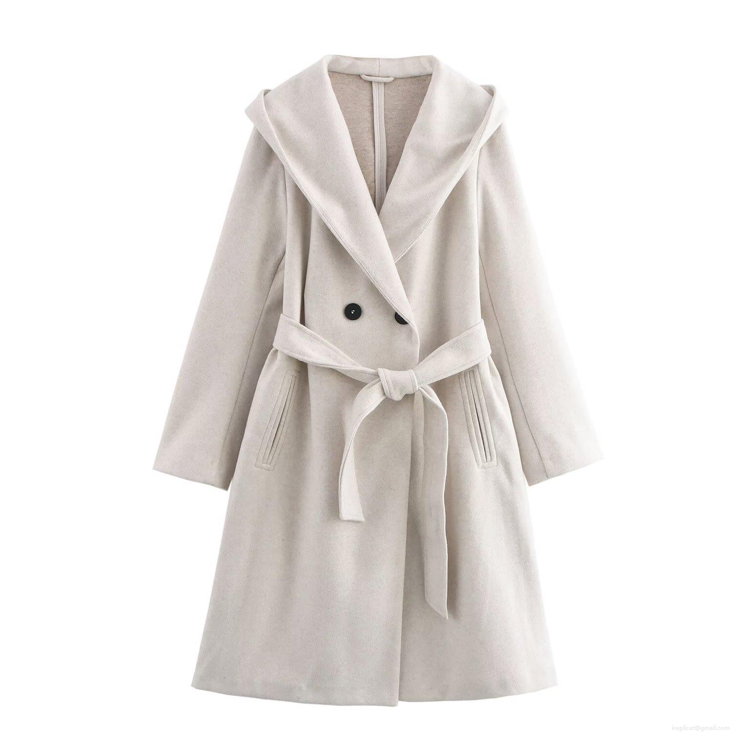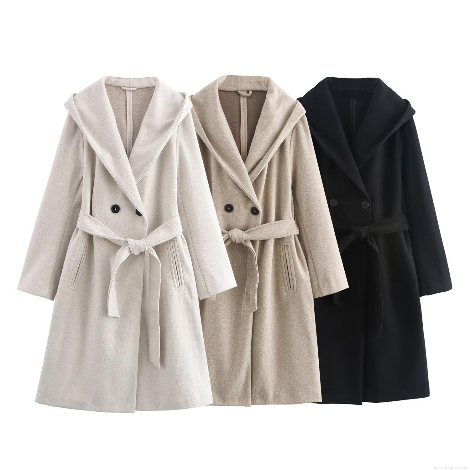 Women's Fashion Hooded Woolen Coat With Belt Long Double Breasted Polyester Jacket Casual Loose Trench Overcoat Outwear Autumn Winter