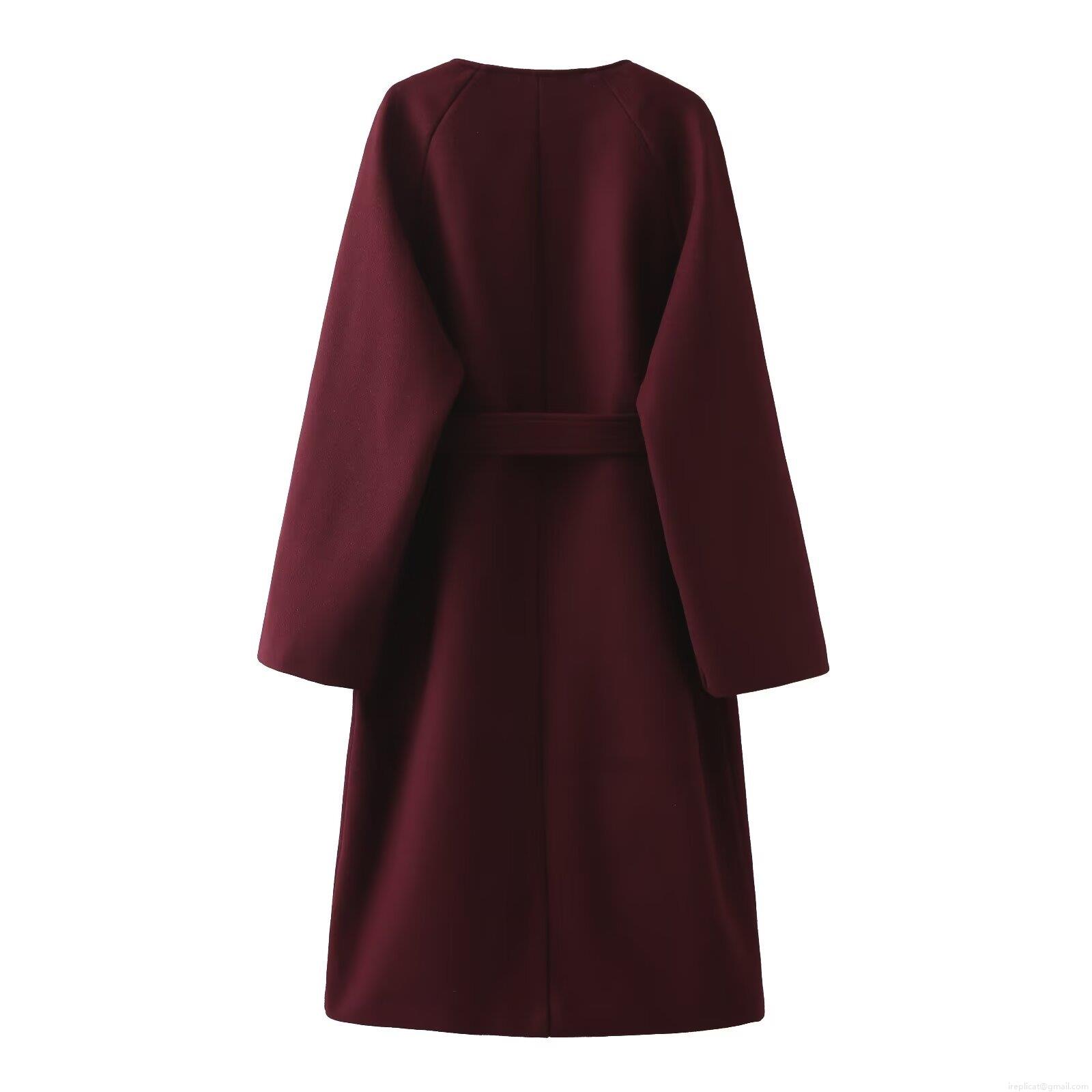Women's Fashion Long Woolen Coat With Matching Scarf Wine Red Lace Up Waist Long Sleeve Outerwear For Autumn Winter Casual Streetwear