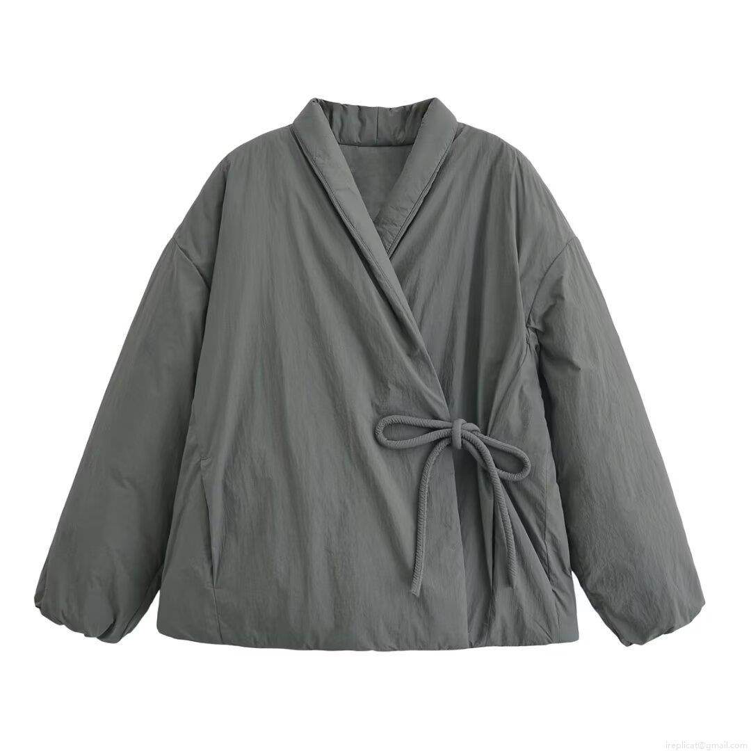• Women's Fashion Quilted Jacket Minimalism Kimono Style Wrap Coat With Side Tie Solid Color Padded Outerwear For Autumn Winter Ladies