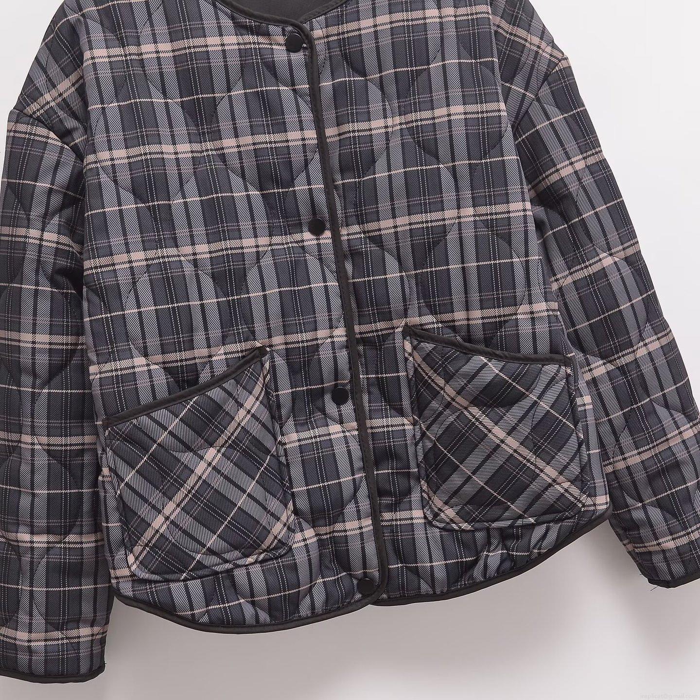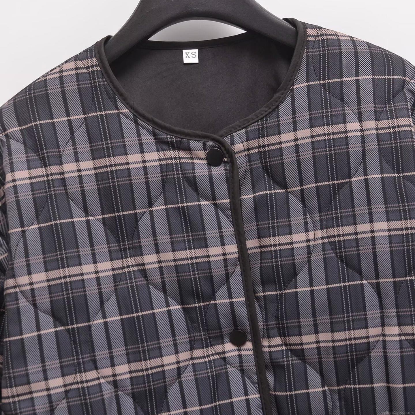 • Women's Fashion Quilted Plaid Jacket Lightweight Warm Round Neck Long Sleeve Padded Coat Casual Winter Outerwear With Pockets