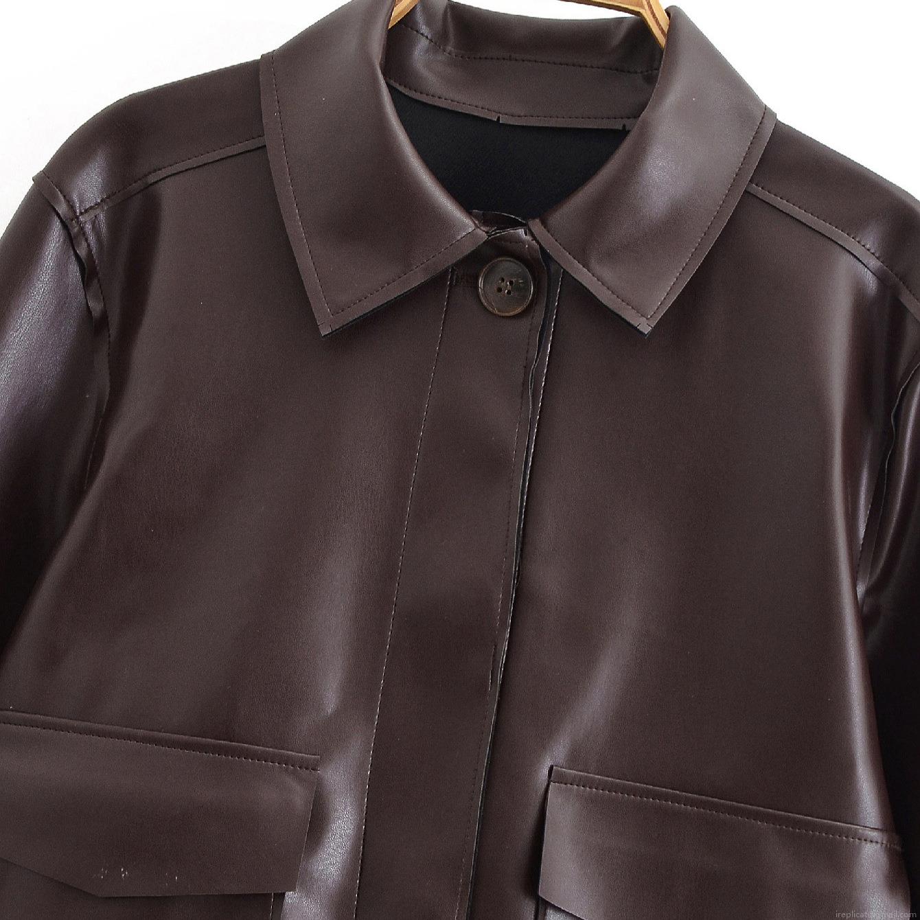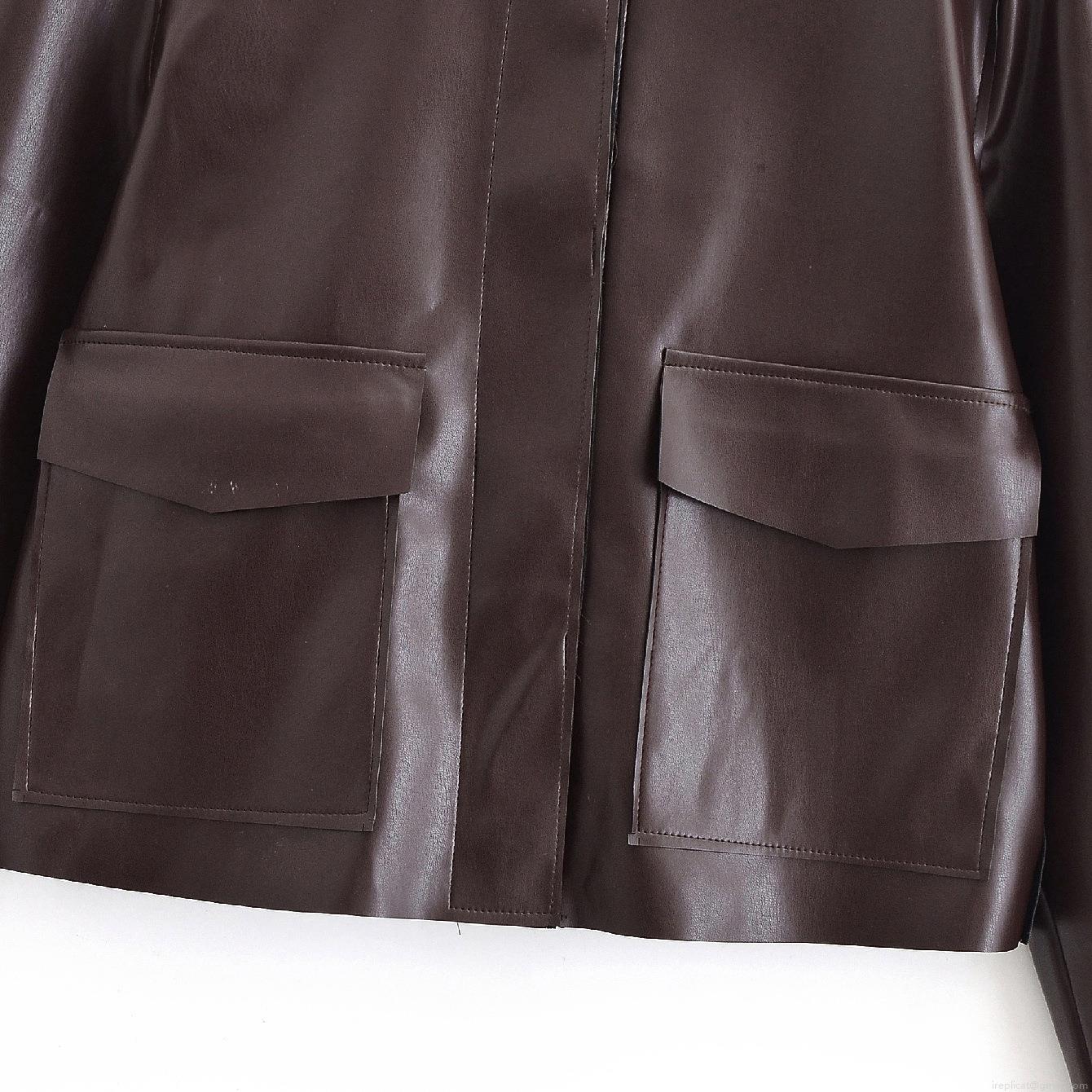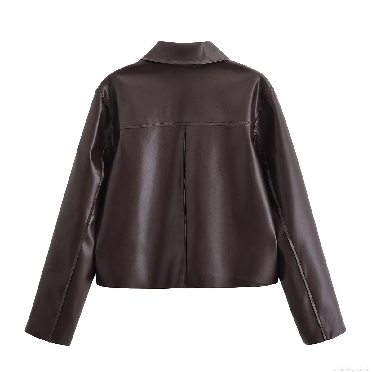 Women's Fashion Red Brown Faux Leather Short Jacket Long Sleeve Lapel PU Coat With Flap Pockets Solid Vintage Streetwear Outerwear For Women