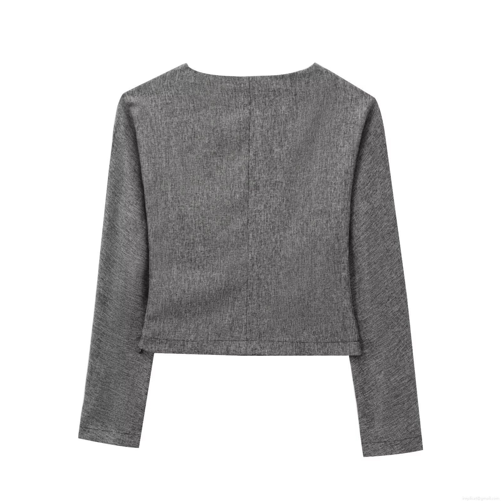 • Women's Fashion Round Neck Long Sleeve Ruched Short Jacket Solid Grey Polyester Blend Slim Fit Outerwear For Women Daily Streetwear Casual Jacket