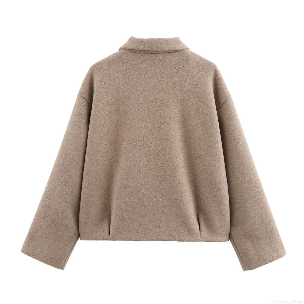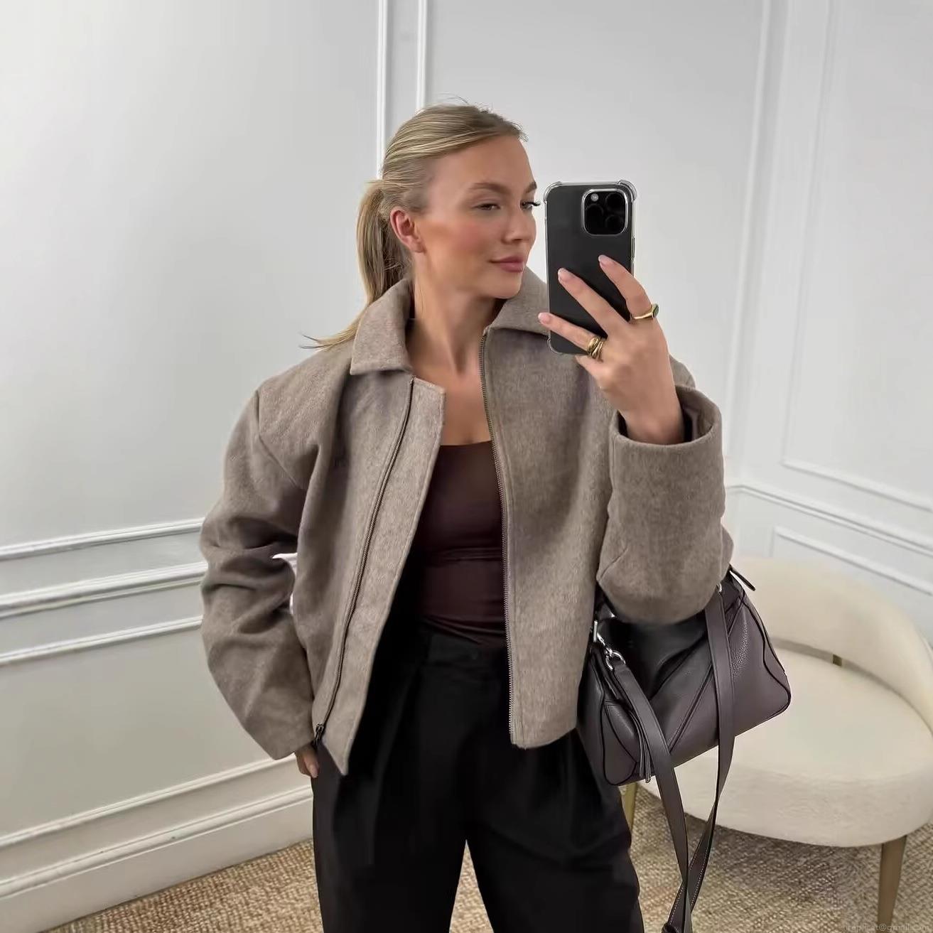 Women's Fashion Short Woolen Tweed Jacket Elegant Lapel Collar Metal Zipper Drop Shoulder Autumn Winter Warm Outerwear For Ladies