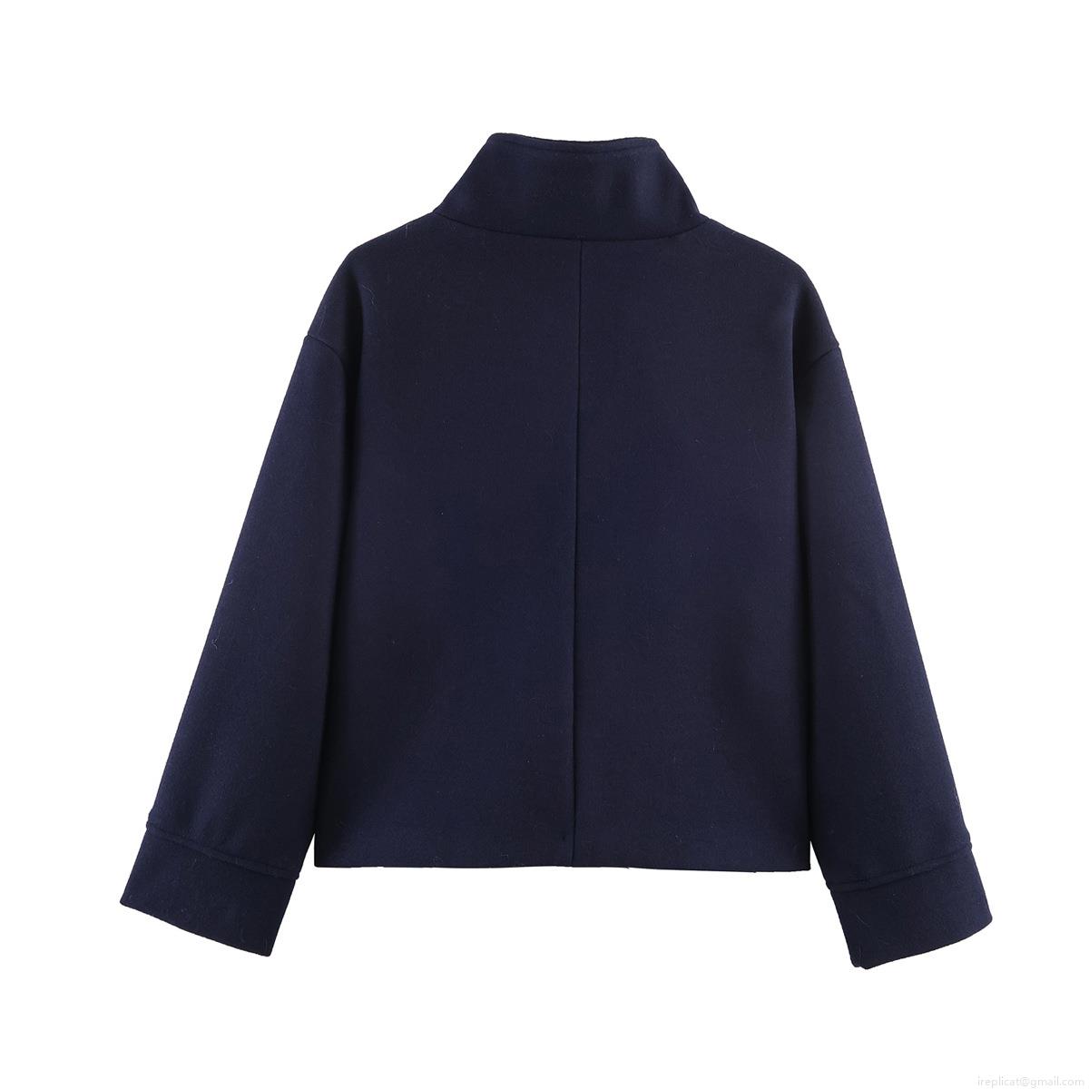 Women's Fashion Stand Collar Woolen Coat Single Breasted Navy Blue Casual Outerwear Loose Short Jacket Streetwear For Ladies Winter
