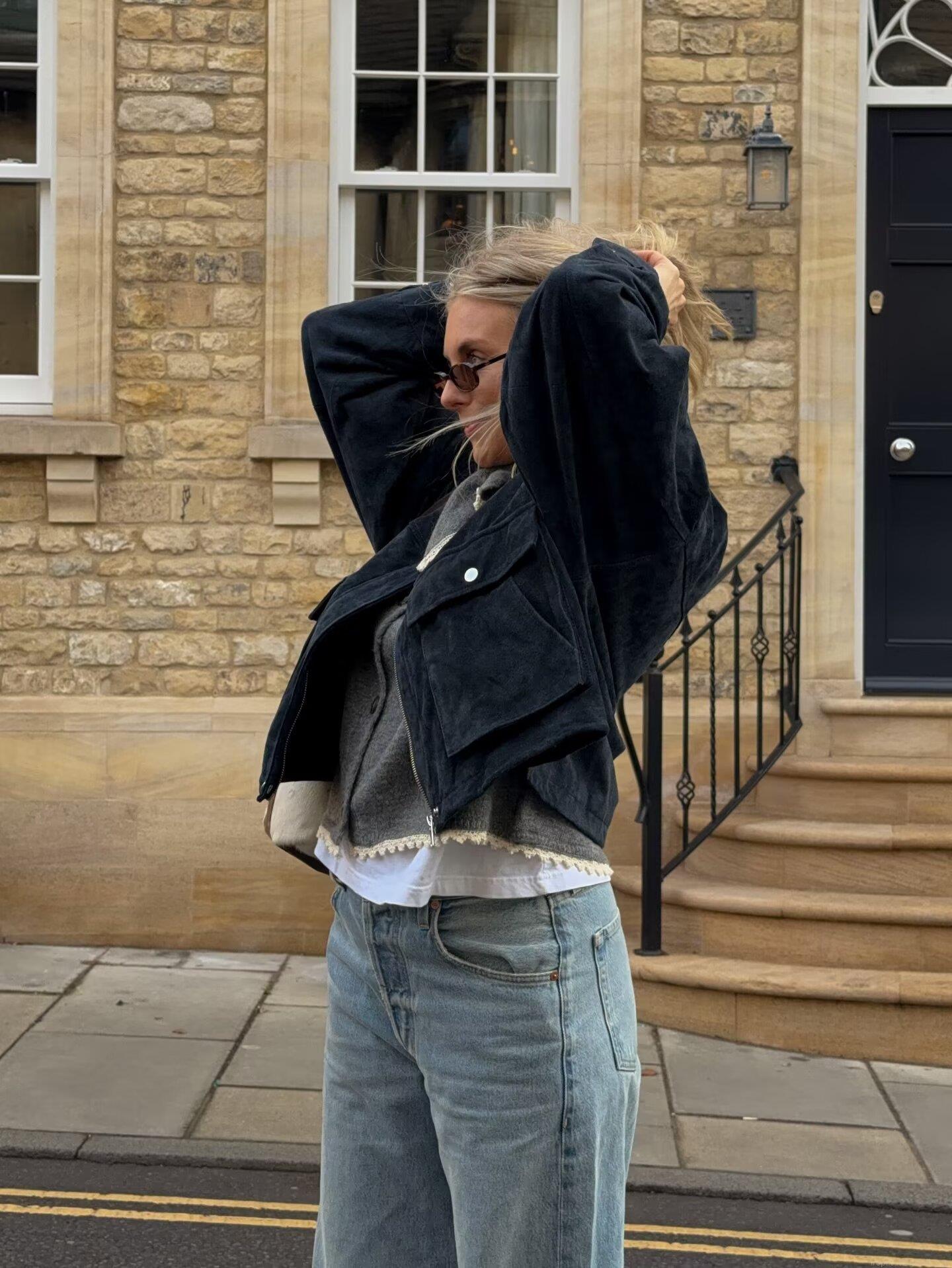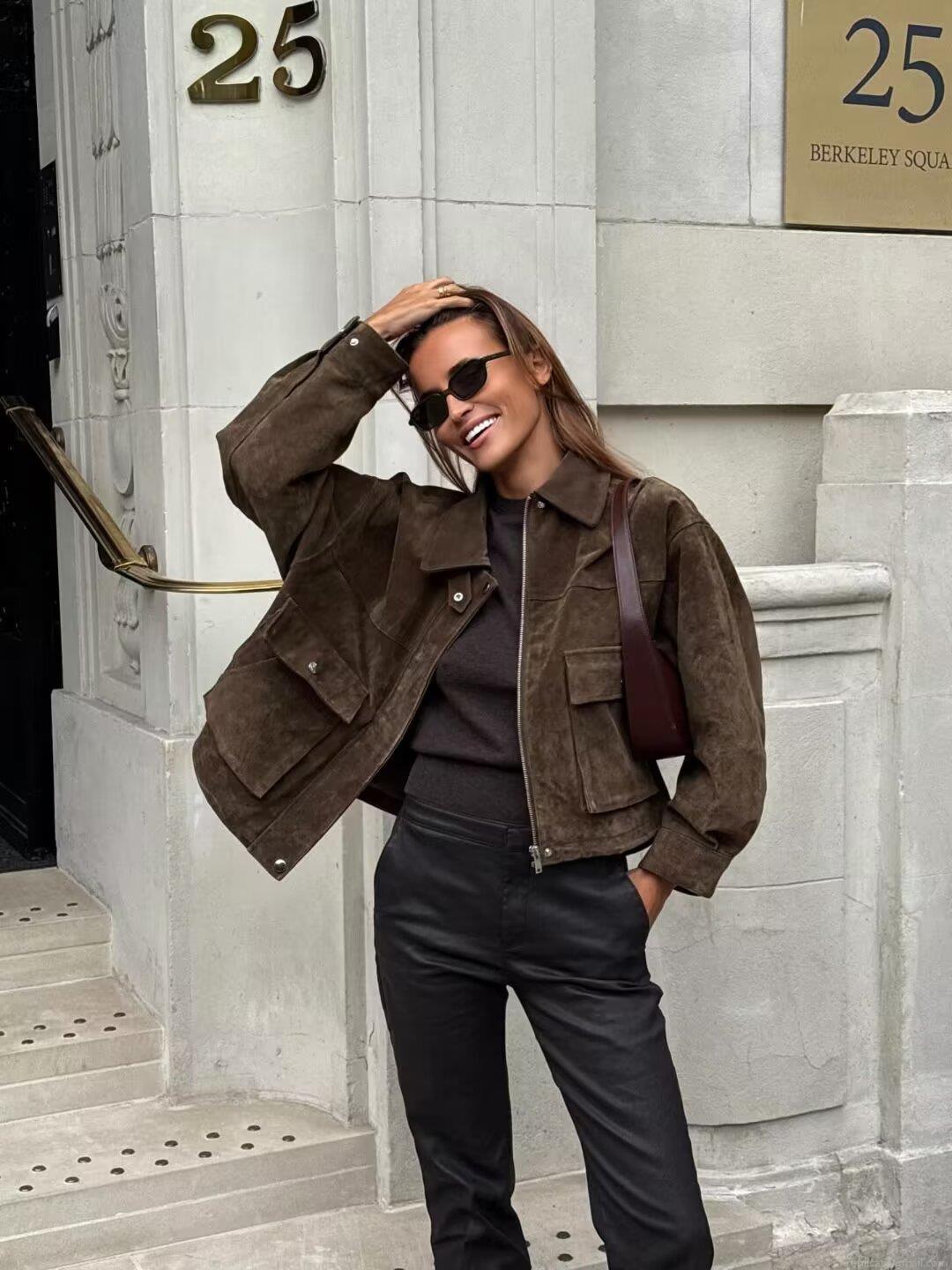 • Women's Fashion Street Style Suede Jacket Loose Long Sleeve Outerwear Top With Cargo Pockets And Metal Buttons For Daily Casual Wear
