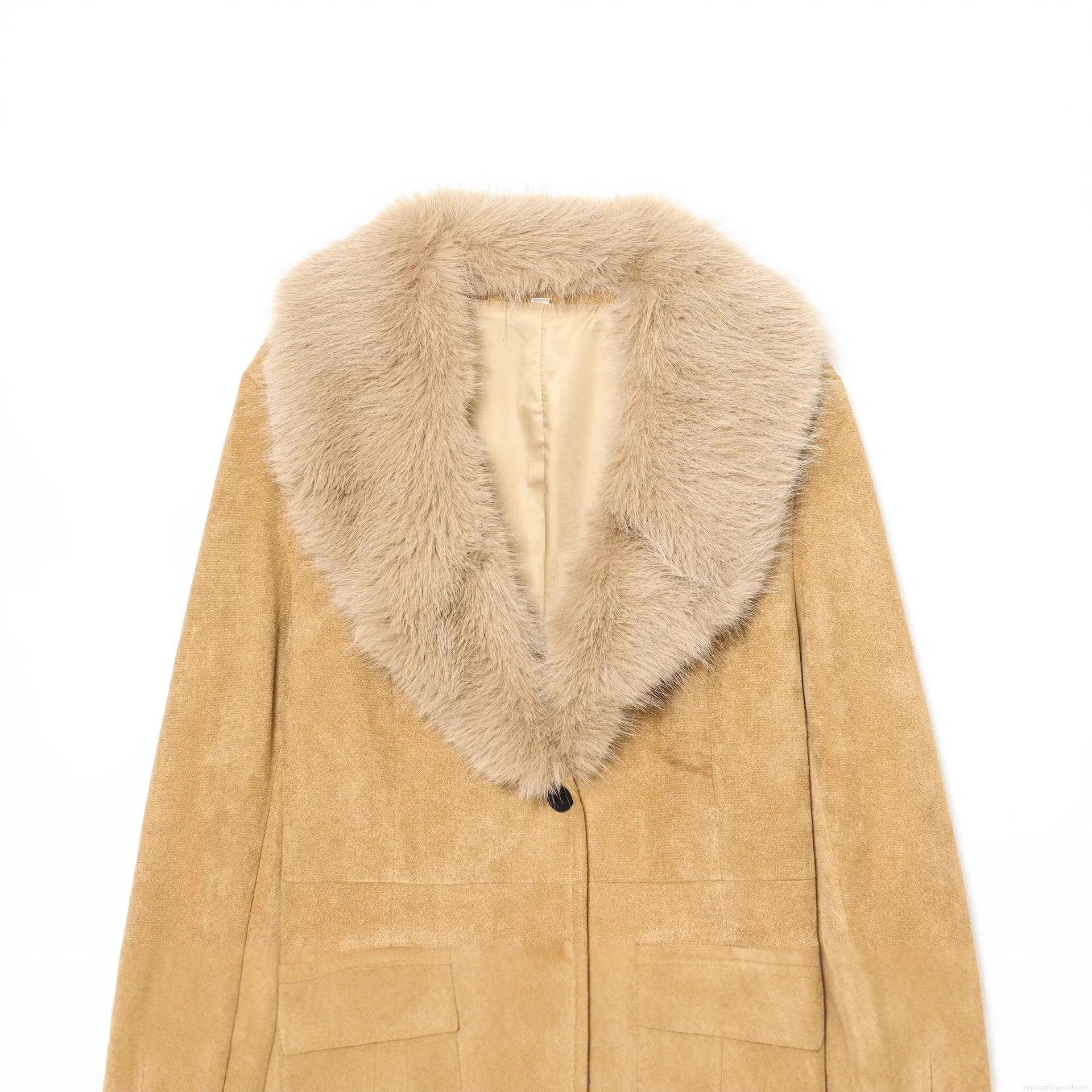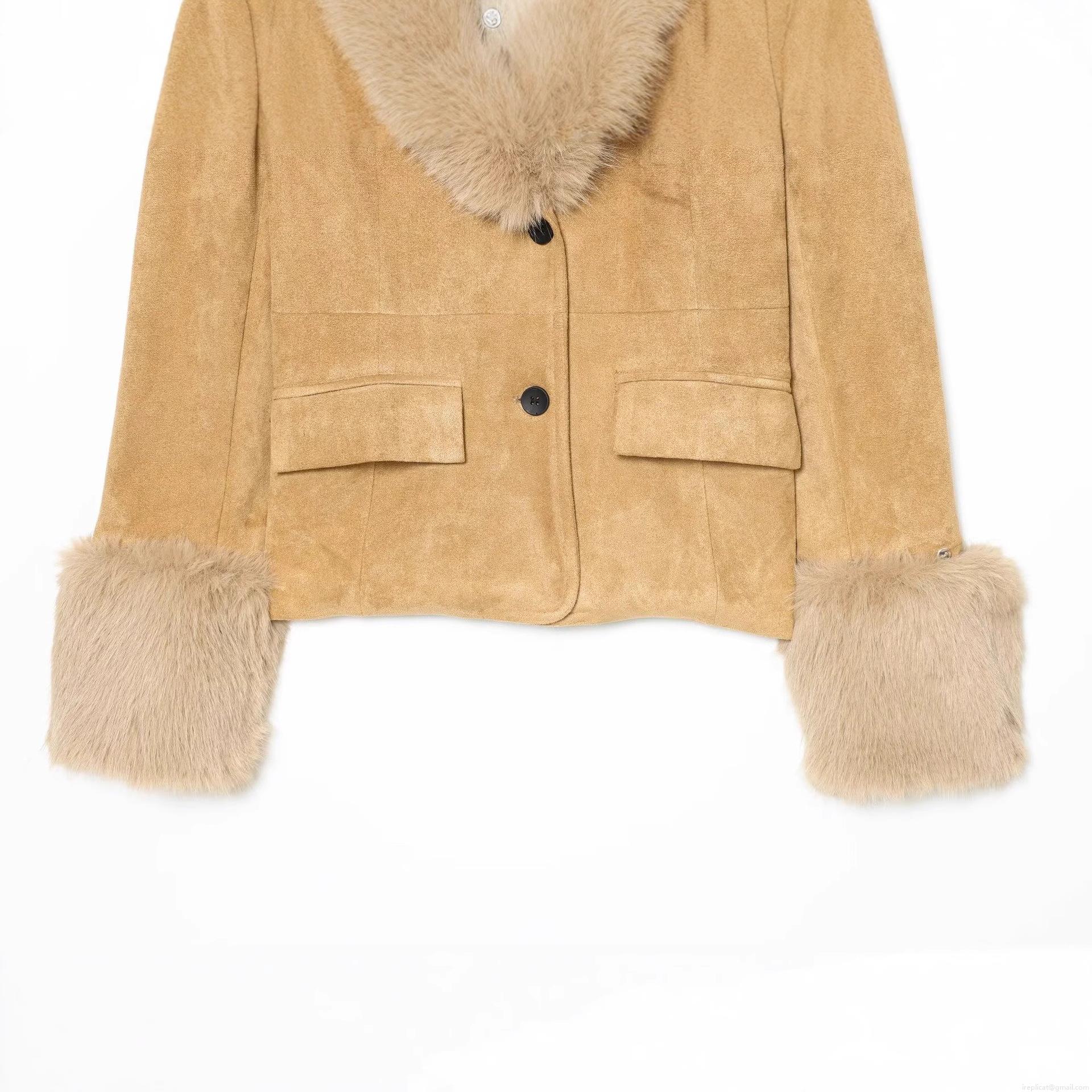 Women's Fashion Suede Faux Fur Trim Jacket Elegant Lapel Single Breasted Short Coat Fall Winter Warm Khaki Outerwear