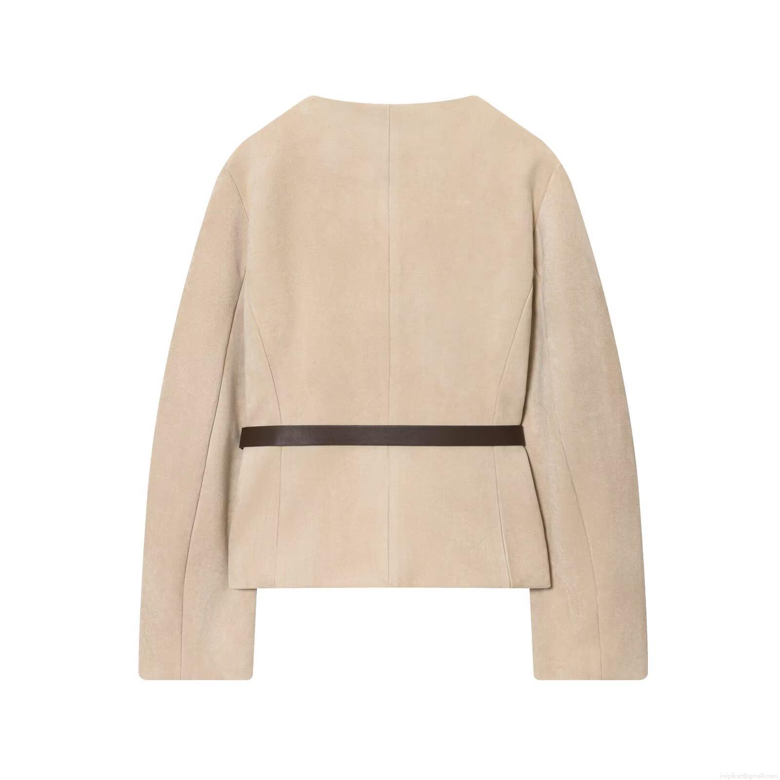 • Women's Fashion Suede Texture Blazer Jacket With Faux Leather Belt Round Neck Long Sleeve Short Outerwear Casual Elegant Autumn Winter Coat For Ladies