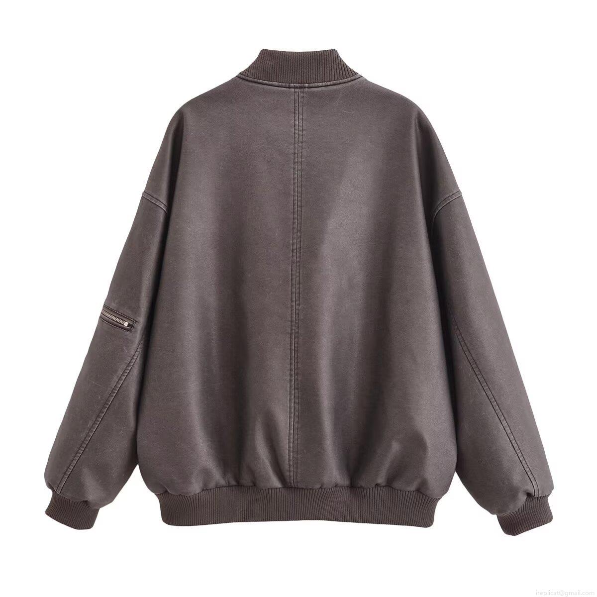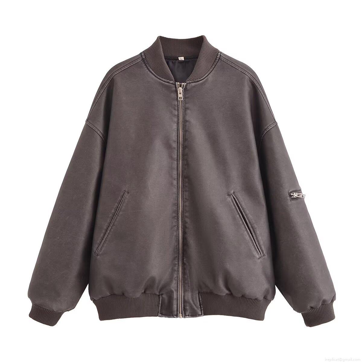 Women's Fashion Washed Faux Leather Bomber Jacket Stand Collar PU Leather Outerwear Long Sleeve Zip Up Solid Color Casual Streetwear Coat