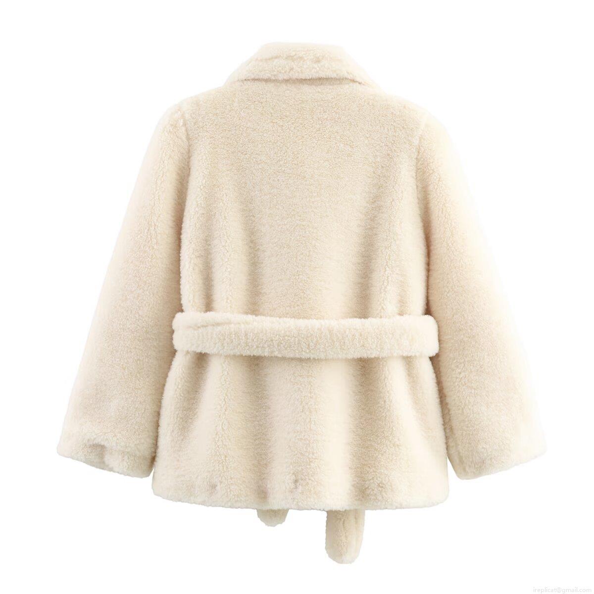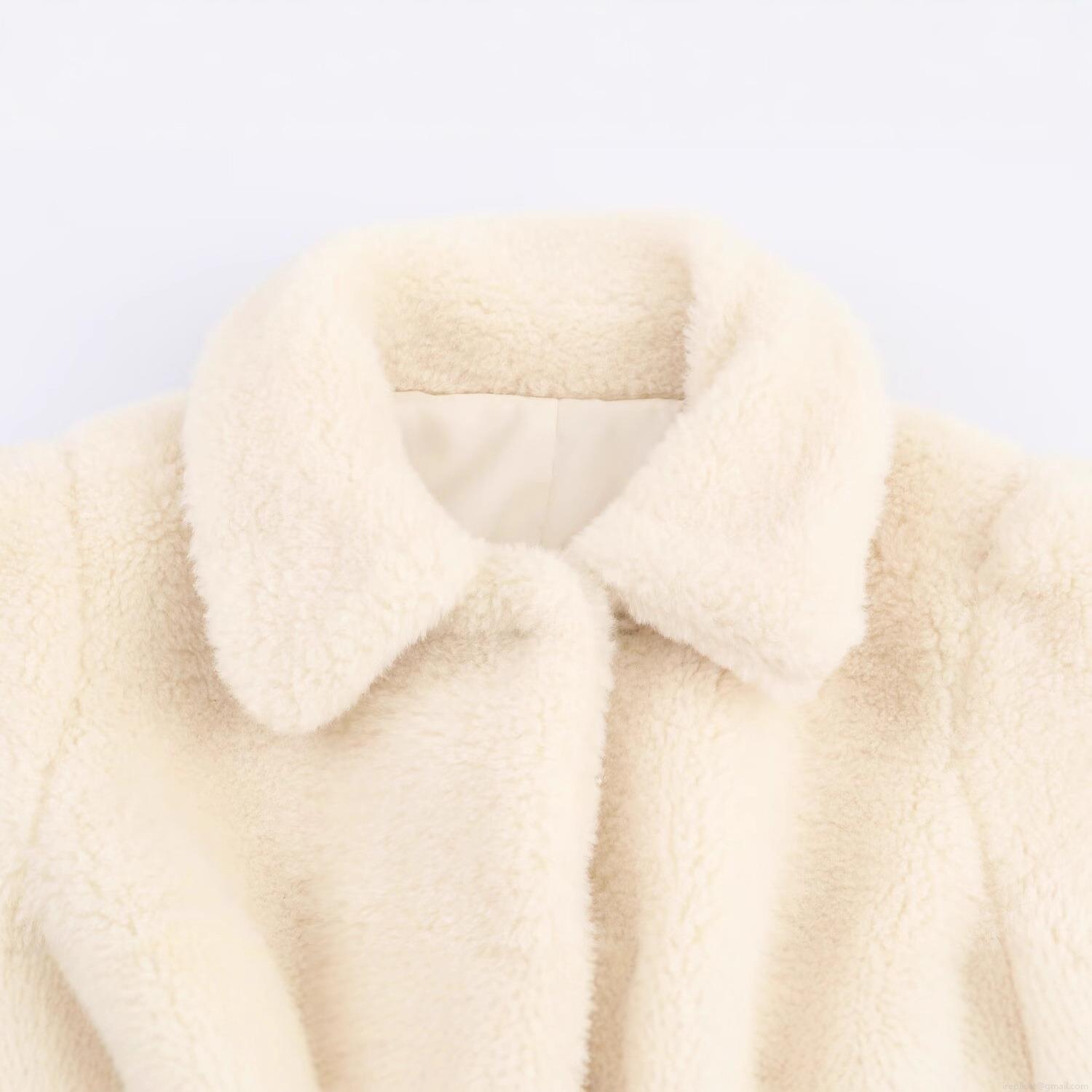 • Women's Faux Fur Coat Cream Lapel Belted Mid-Length Jacket Winter Warm Outwear Solid Color Fashion Plush Overcoat With Belt