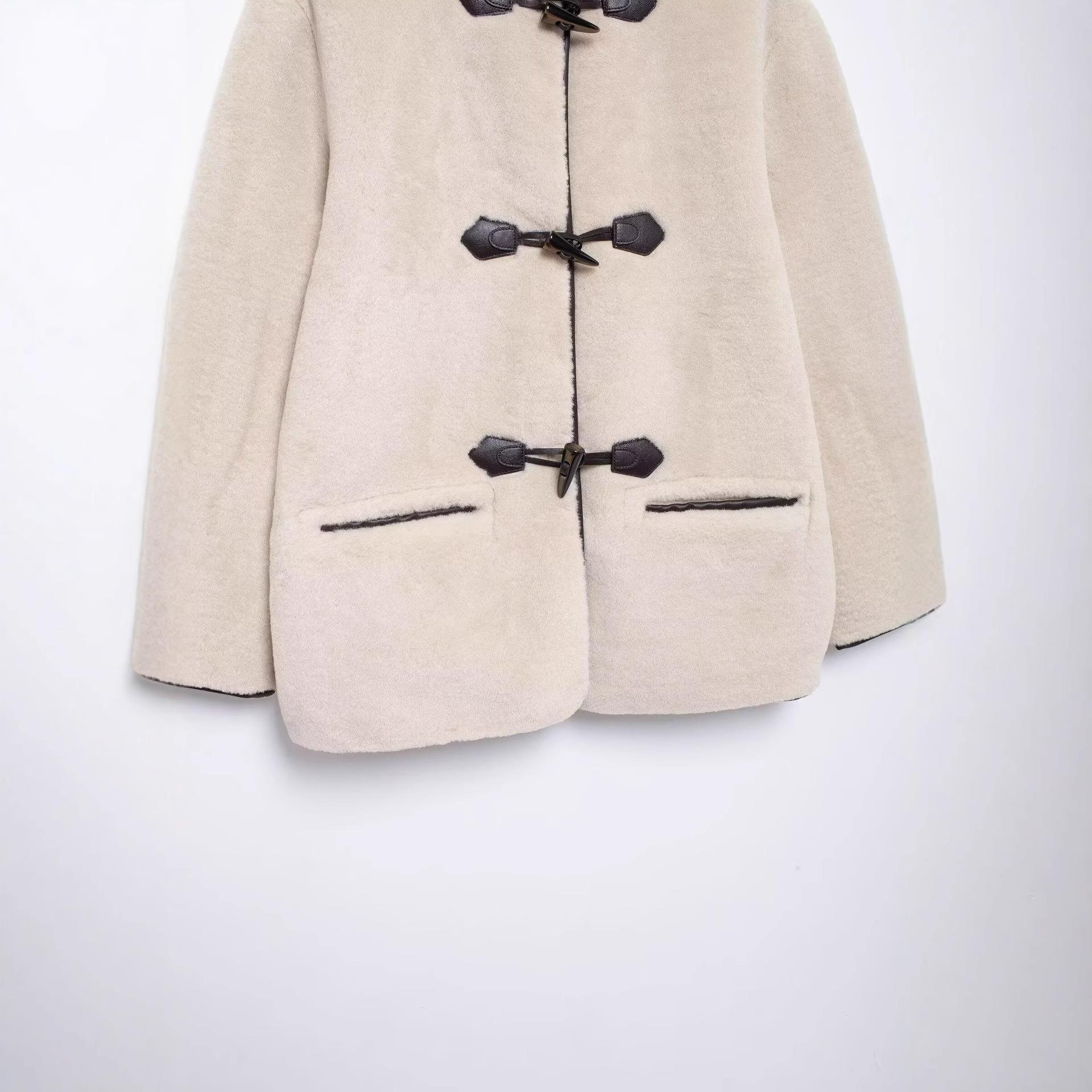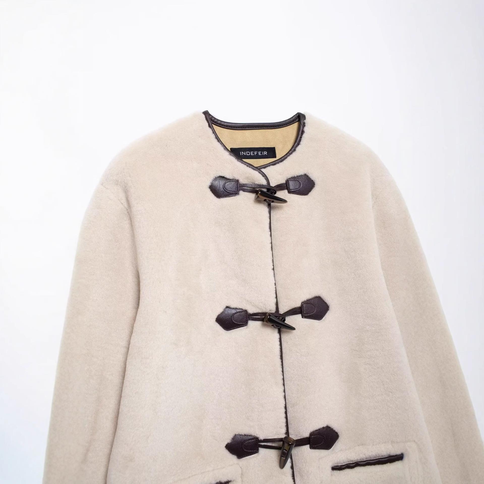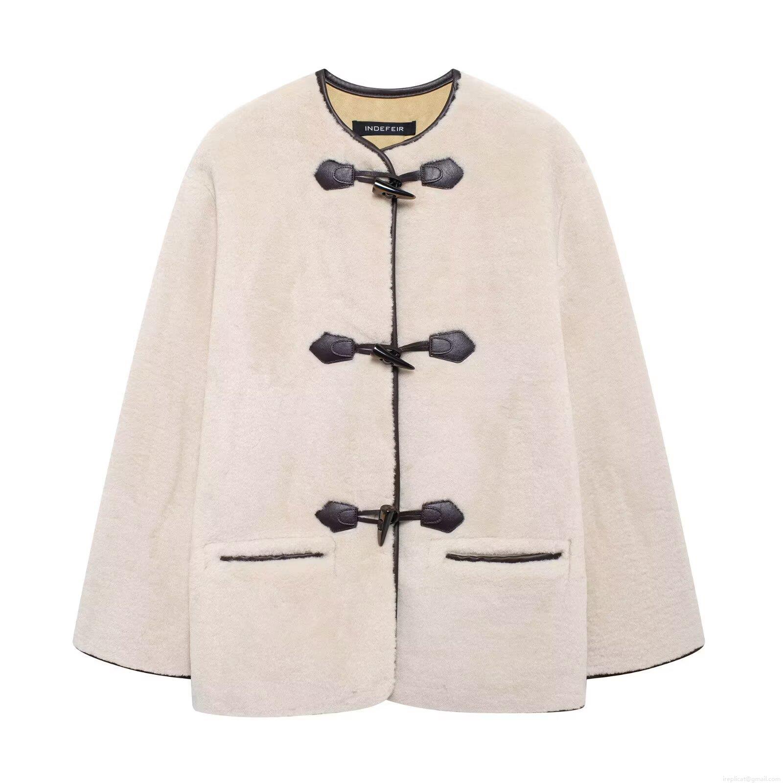 Women's Faux Fur Coat Luxury Lamb Wool Jacket With Toggle Buttons Contrast Leather Trim Round Neck Warm Winter Fleece Outerwear For Ladies