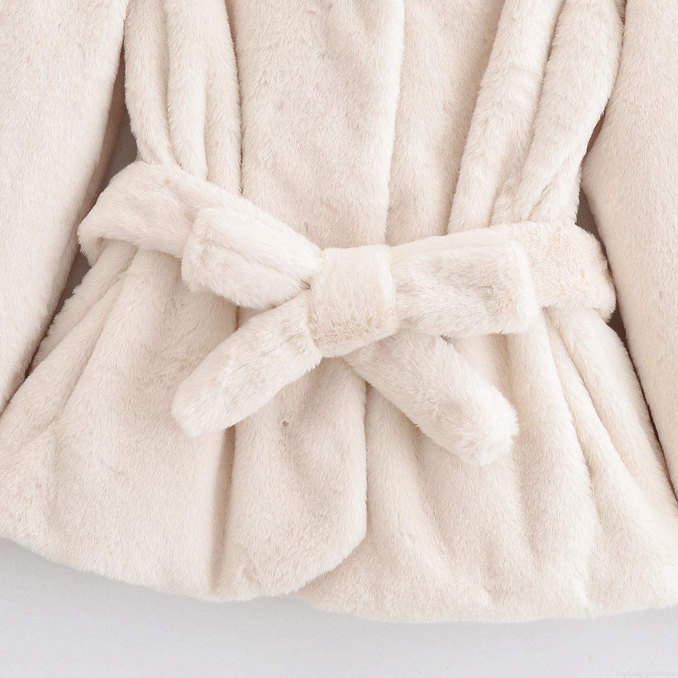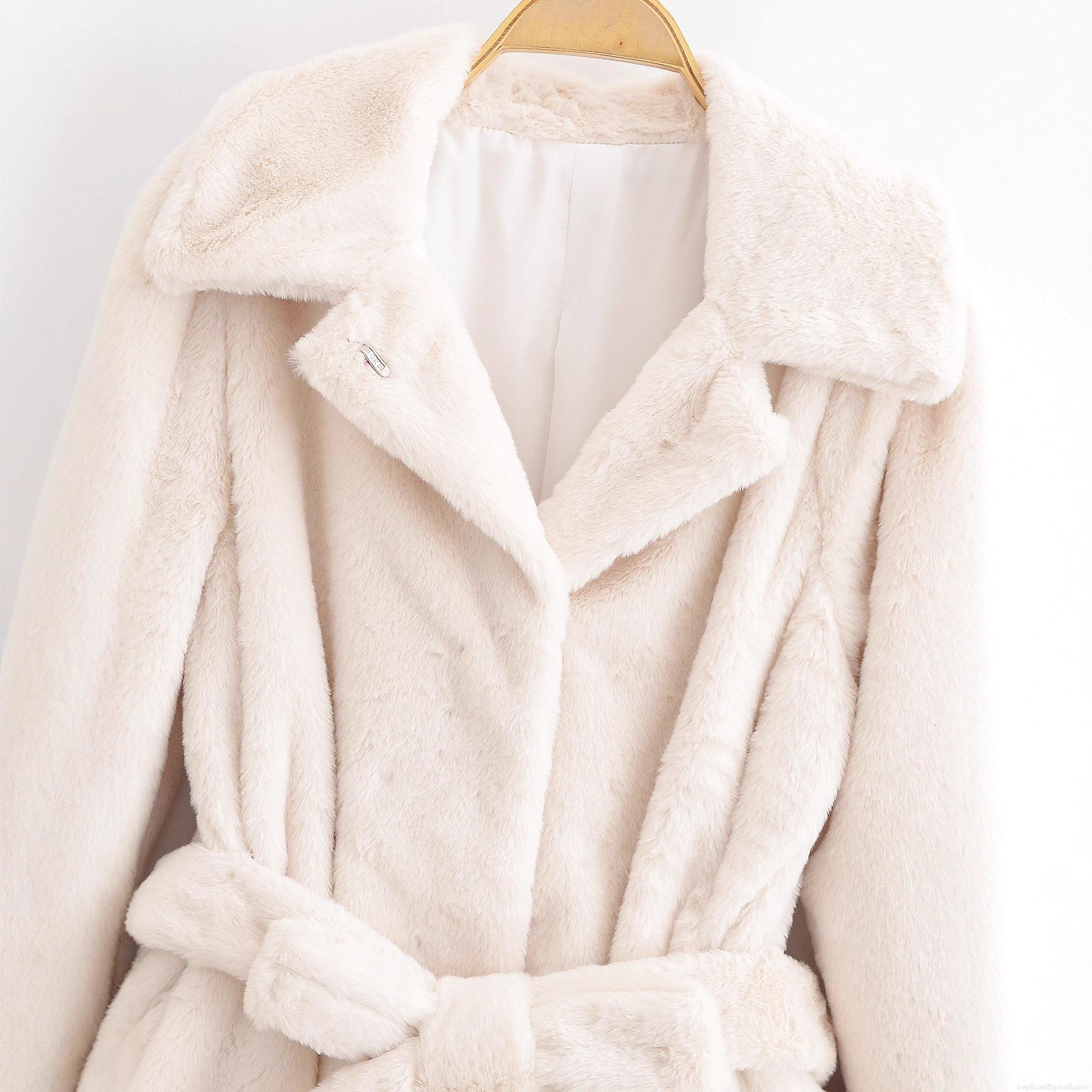 • Women's Faux Fur Coat Winter Fashion Lapel Mid-Length Jacket With Waist Belt Solid Color Warm Streetwear Outerwear Creamy White