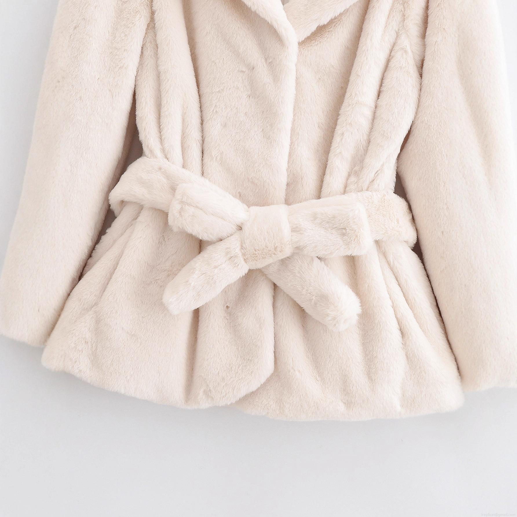 Women's Faux Fur Coat With Belt Elegant Lapel Long Sleeve Solid Color Winter Jacket Casual Outerwear Fashion Warm Cream Beige Short Furry Overcoat