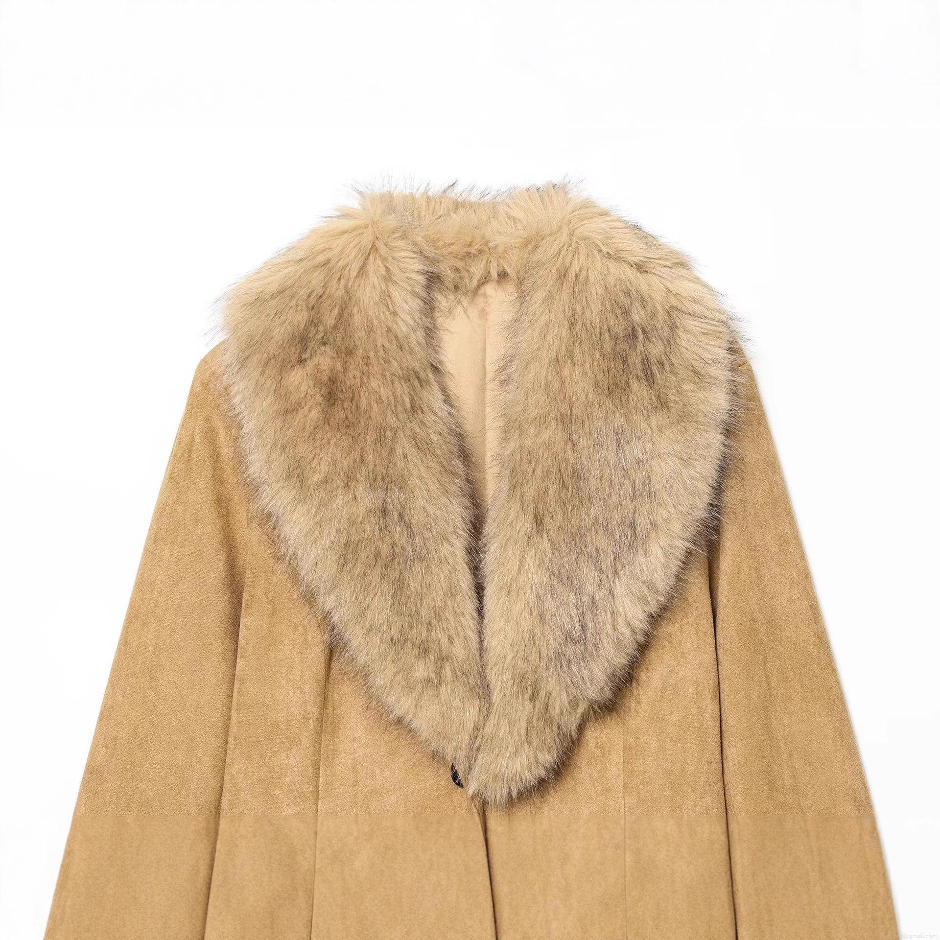 Women's Faux Fur Collar Suede Jacket Warm Winter Streetwear Single Breasted Long Sleeve Khaki Outerwear Fashion Coats For Ladies