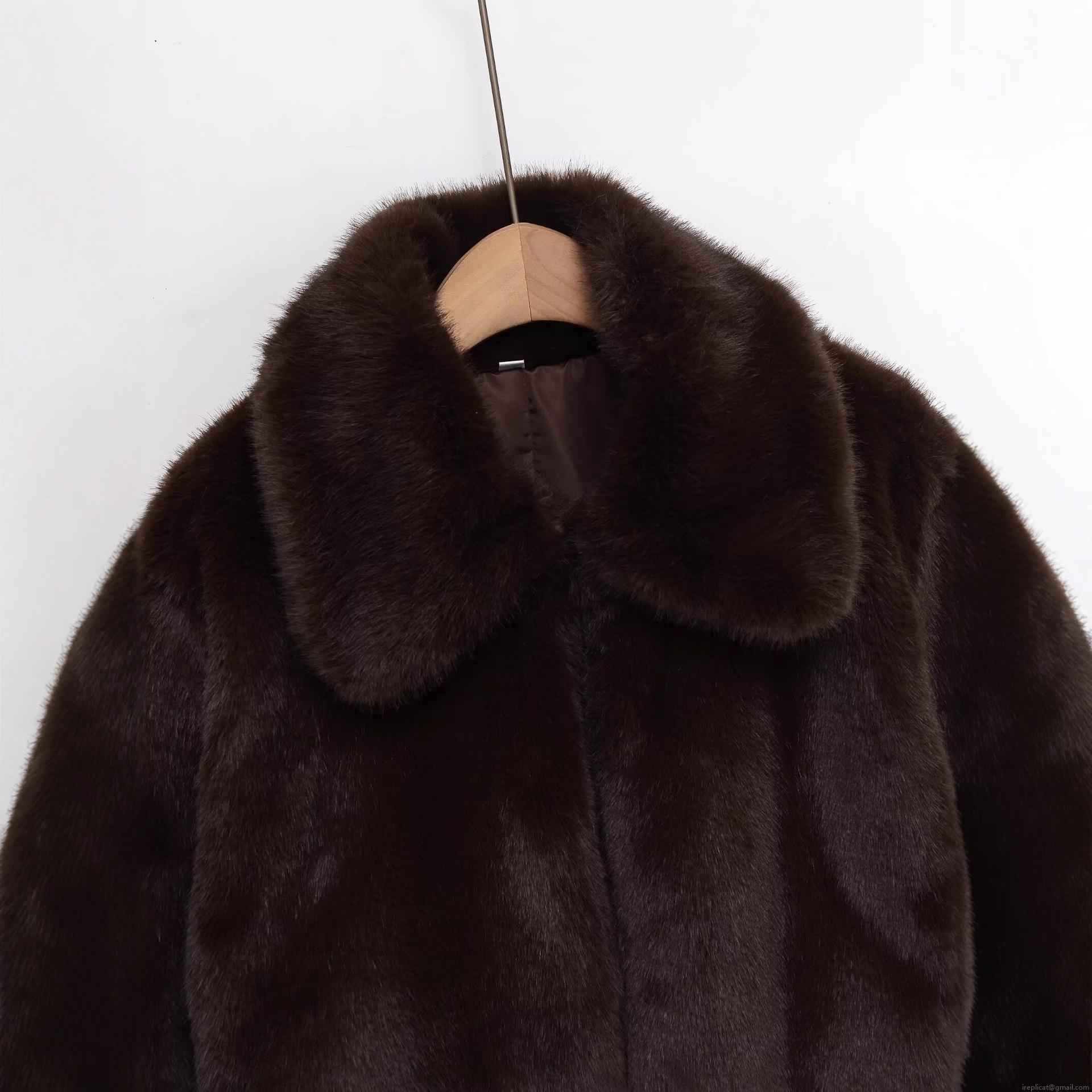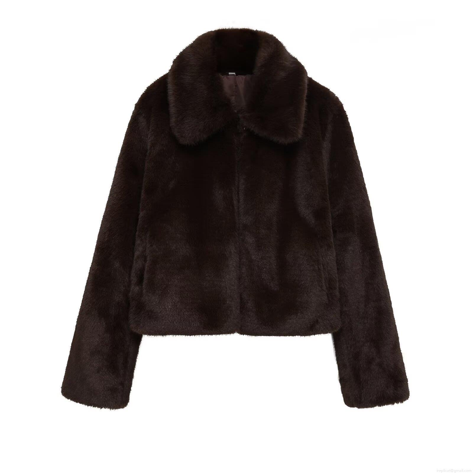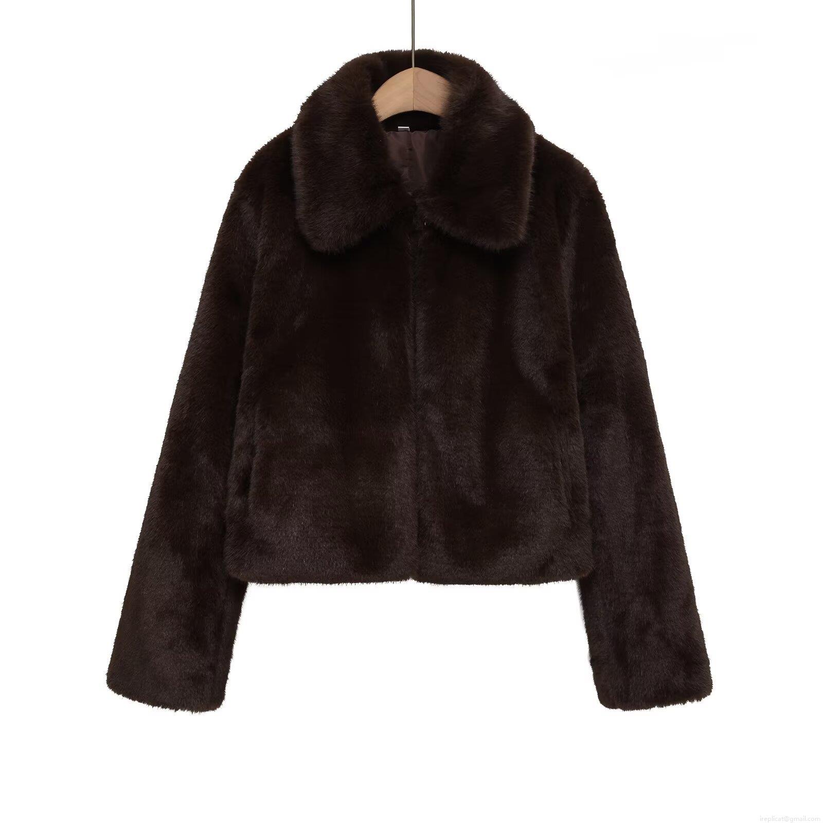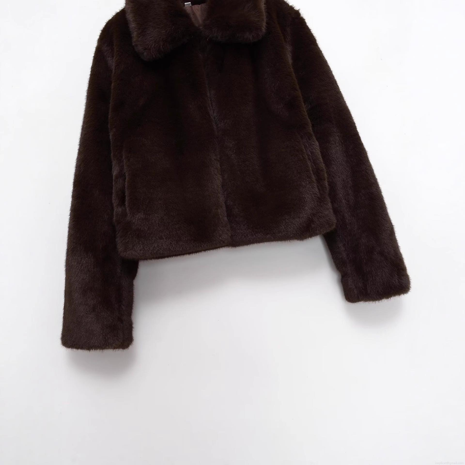 • Women's Faux Fur Cropped Jacket Fashion Lapel Long Sleeve Winter Warm Coat Solid Dark Brown Outwear For Women Elegant Plush Jacket